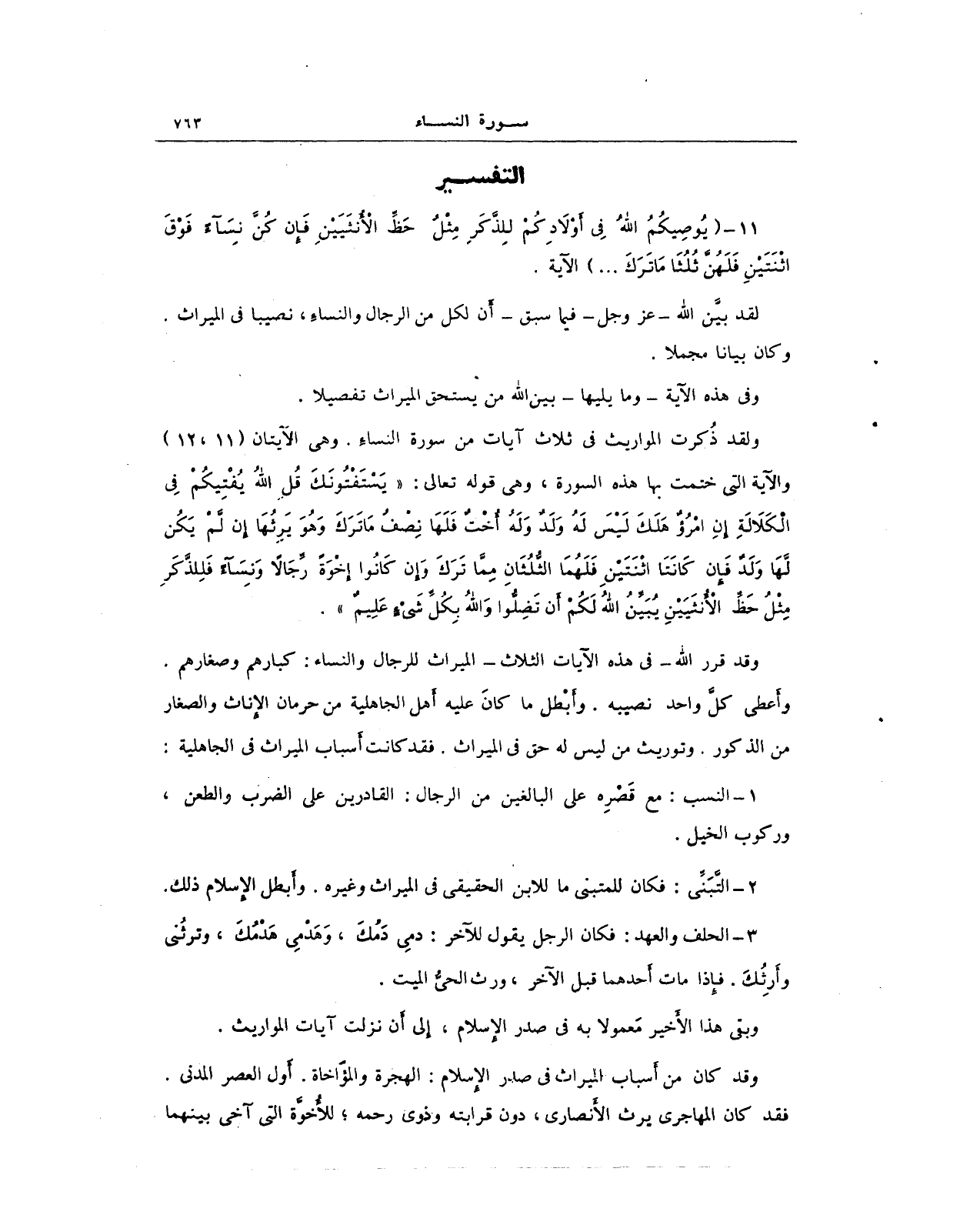 ولقد ذُكرت المواريث في ثلاث آيات من سورة. وهي الآيتان (11، 12) والآية التي ختمت بها هذه السورة، وهي قوله تعالى: {يَسْتَفْتُونَكَ قُلِ اللَّهُ يُفْتِيكُمْ فِي الْكَلَالَةِ إِنِ امْرُؤٌ هَلَكَ لَيْسَ لَهُ وَلَدٌ وَلَهُ أُخْتٌ فَلَهَا نِصْفُ مَا تَرَكَ وَهُوَ يَرِثُهَا إِنْ لَمْ يَكُنْ لَهَا وَلَدٌ فَإِنْ كَانَتَا اثْنَتَيْنِ فَلَهُمَا الثُّلُثَانِ مِمَّا تَرَكَ وَإِنْ كَانُوا إِخْوَةً رِجَالًا وَنِسَاءً فَلِلذَّكَرِ مِثْلُ حَظِّ الْأُنْثَيَيْنِ يُبَيِّنُ اللَّهُ لَكُمْ أَنْ تَضِلُّوا وَاللَّهُ بِكُلِّ شَيْءٍ عَلِيمٌ}.