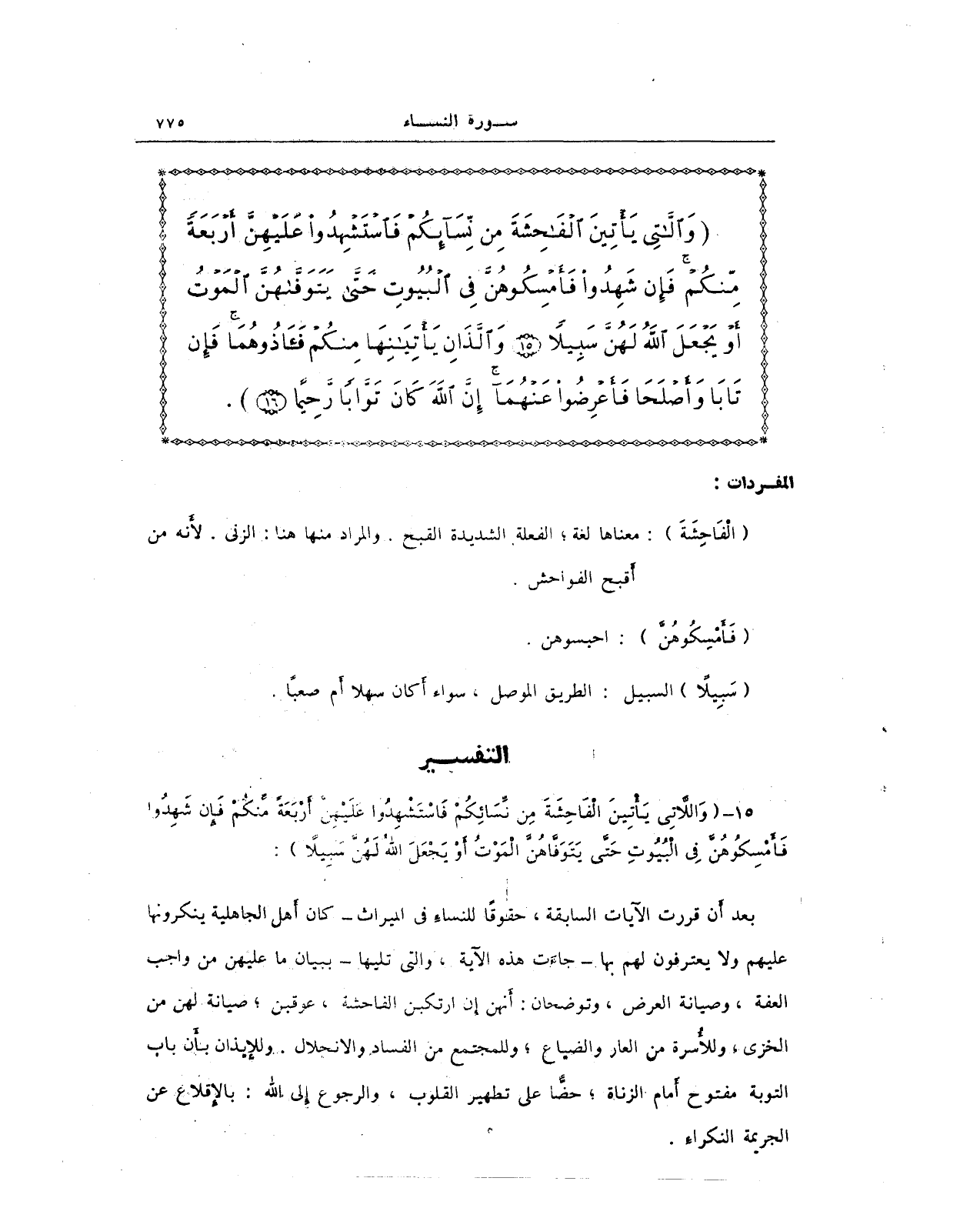 {وَاللَّاتِي يَأْتِينَ الْفَاحِشَةَ مِنْ نِسَائِكُمْ فَاسْتَشْهِدُوا عَلَيْهِنَّ أَرْبَعَةً مِنْكُمْ فَإِنْ شَهِدُوا فَأَمْسِكُوهُنَّ فِي الْبُيُوتِ حَتَّى يَتَوَفَّاهُنَّ الْمَوْتُ أَوْ يَجْعَلَ اللَّهُ لَهُنَّ سَبِيلًا (15) وَاللَّذَانِ يَأْتِيَانِهَا مِنْكُمْ فَآذُوهُمَا فَإِنْ تَابَا وَأَصْلَحَا فَأَعْرِضُوا عَنْهُمَا إِنَّ اللَّهَ كَانَ تَوَّابًا رَحِيمًا (16)}.