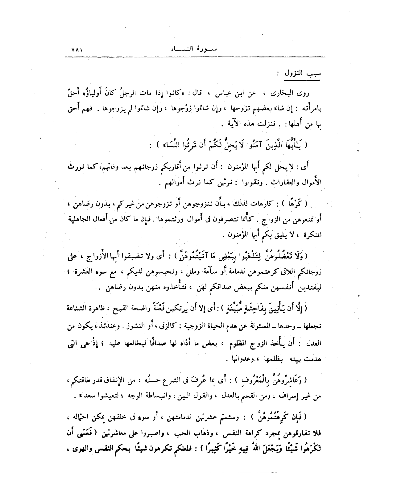 روى البخاري، عن ابن عباس، قال: "كانوا إذا مات الرجلُ كانَ أولياؤُه أحقّ بامرأته: إن شاءَ بعضهم تزوجها، وإِن شاءُوا زوّجوها، وإن شاءُوا لم يزوجوها. فهم أحق بها من أهلها". فنزلت هذه الآية.