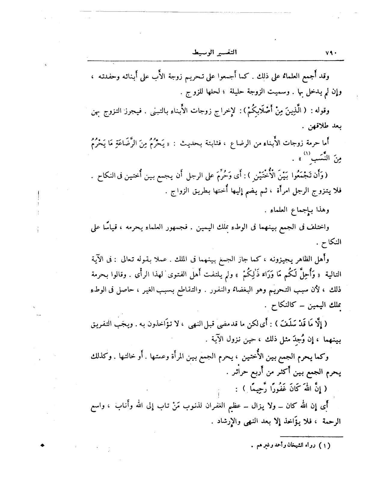 وأهل الظاهر يجيزونه، كما جاز الجمع بينهما في الملك. عملا بقوله تعالى: في الآية التالية {وَأُحِلَّ لَكُمْ مَا وَرَاءَ ذَلِكُمْ} ولم يلتفت أهل الفتوى لهذا الرأي. وقالوا بحرمة ذلك، لأن سبب التحريم وهو البغضاءُ والنفور. والتقاطع بسبب الغير، حاصل في الوطء بملك اليمين - كالنكاح.