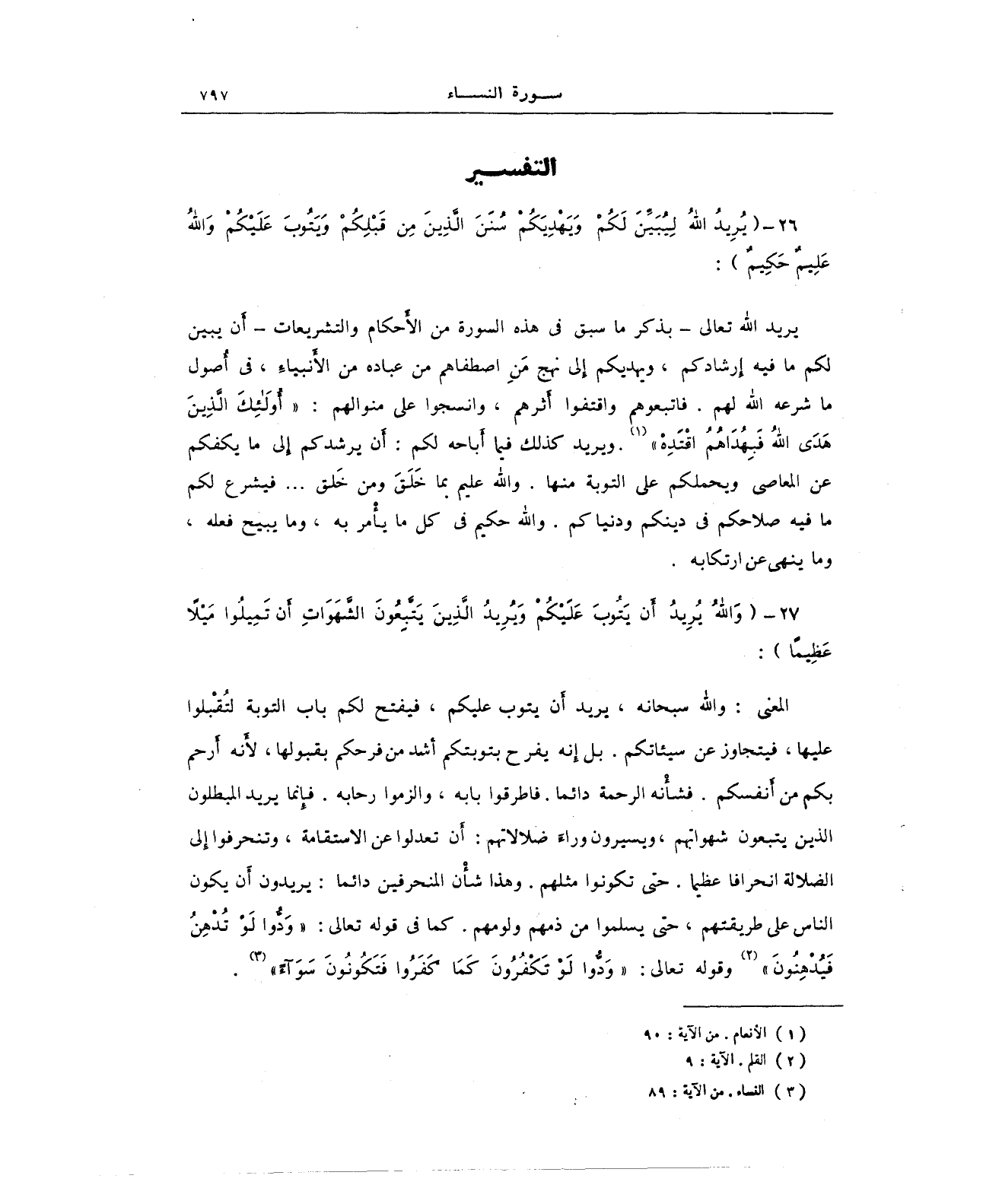 26 - {يُرِيدُ اللَّهُ لِيُبَيِّنَ لَكُمْ وَيَهْدِيَكُمْ سُنَنَ الَّذِينَ مِنْ قَبْلِكُمْ وَيَتُوبَ عَلَيْكُمْ وَاللَّهُ عَلِيمٌ حَكِيمٌ}: