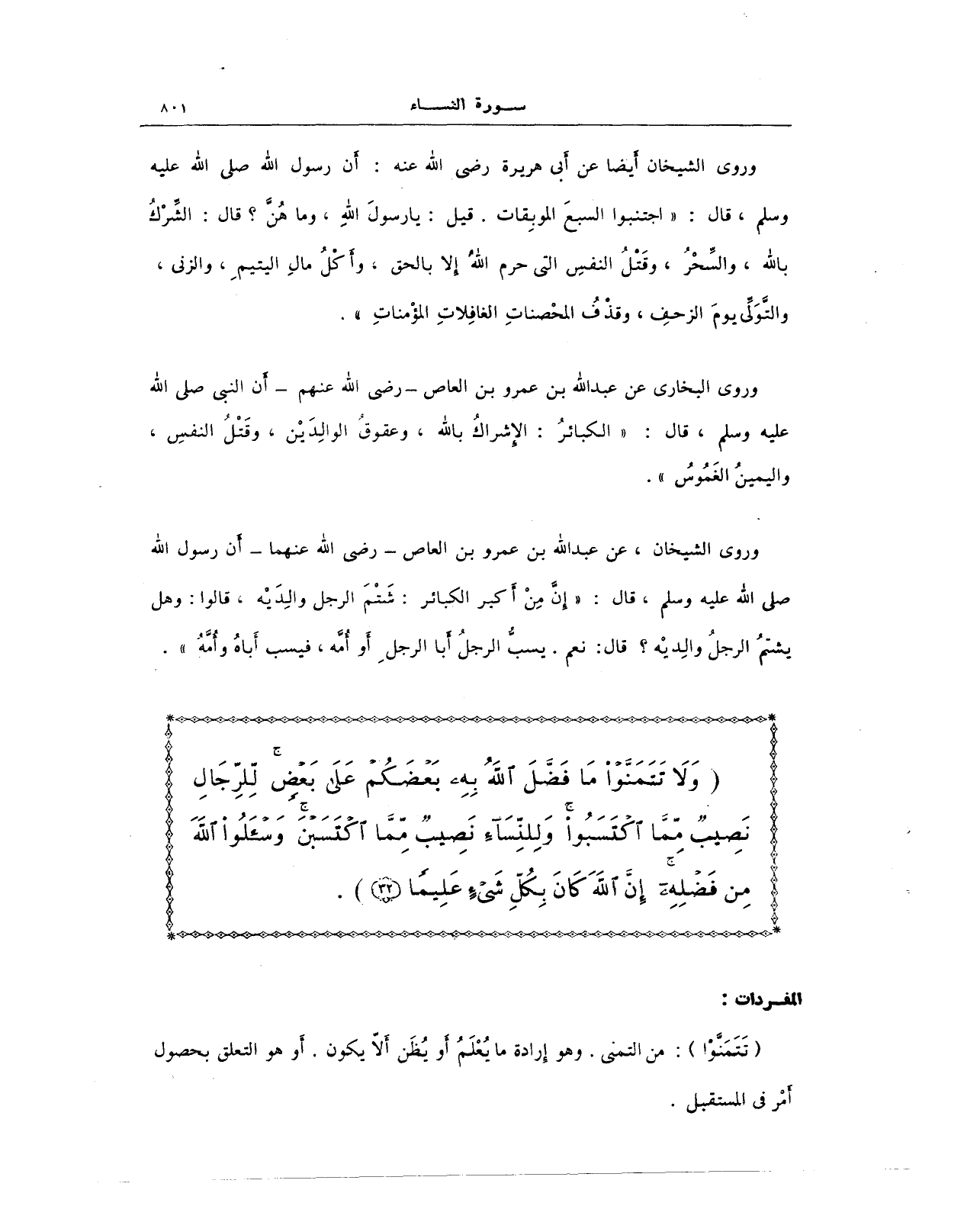{وَلَا تَتَمَنَّوْا مَا فَضَّلَ اللَّهُ بِهِ بَعْضَكُمْ عَلَى بَعْضٍ لِلرِّجَالِ نَصِيبٌ مِمَّا اكْتَسَبُوا وَلِلنِّسَاءِ نَصِيبٌ مِمَّا اكْتَسَبْنَ وَاسْأَلُوا اللَّهَ مِنْ فَضْلِهِ إِنَّ اللَّهَ كَانَ بِكُلِّ شَيْءٍ عَلِيمًا (32)}.