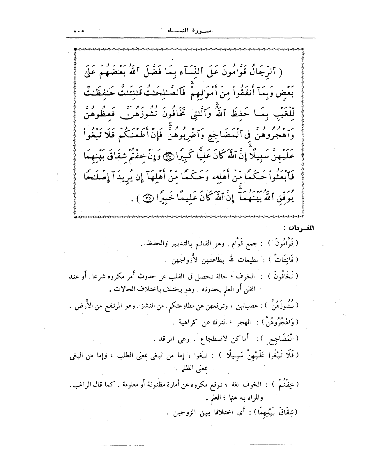 {الرِّجَالُ قَوَّامُونَ عَلَى النِّسَاءِ بِمَا فَضَّلَ اللَّهُ بَعْضَهُمْ عَلَى بَعْضٍ وَبِمَا أَنْفَقُوا مِنْ أَمْوَالِهِمْ فَالصَّالِحَاتُ قَانِتَاتٌ حَافِظَاتٌ لِلْغَيْبِ بِمَا حَفِظَ اللَّهُ وَاللَّاتِي تَخَافُونَ نُشُوزَهُنَّ فَعِظُوهُنَّ وَاهْجُرُوهُنَّ فِي الْمَضَاجِعِ وَاضْرِبُوهُنَّ فَإِنْ أَطَعْنَكُمْ فَلَا تَبْغُوا عَلَيْهِنَّ سَبِيلًا إِنَّ اللَّهَ كَانَ عَلِيًّا كَبِيرًا (34) وَإِنْ خِفْتُمْ شِقَاقَ بَيْنِهِمَا فَابْعَثُوا حَكَمًا مِنْ أَهْلِهِ وَحَكَمًا مِنْ أَهْلِهَا إِنْ يُرِيدَا إِصْلَاحًا يُوَفِّقِ اللَّهُ بَيْنَهُمَا إِنَّ اللَّهَ كَانَ عَلِيمًا خَبِيرًا (35)}.