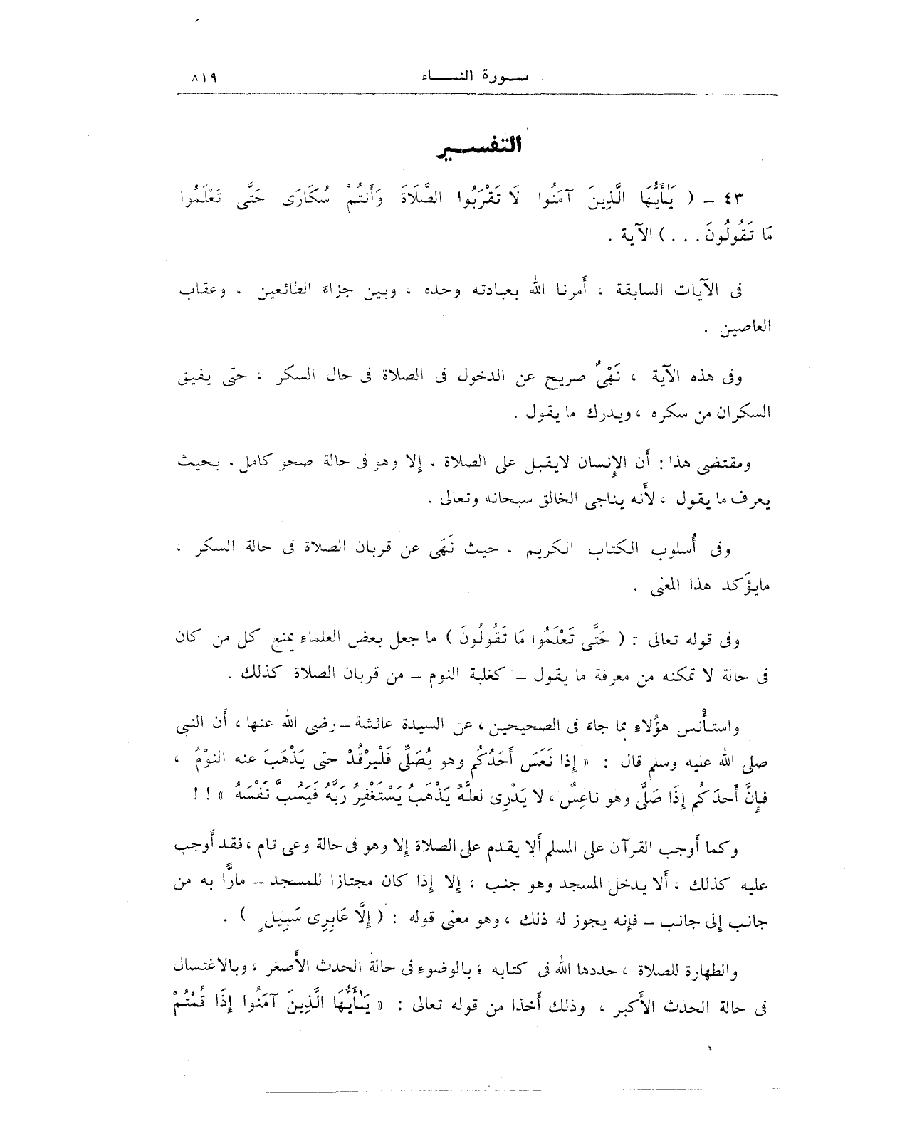 43 - {يَا أَيُّهَا الَّذِينَ آمَنُوا لَا تَقْرَبُوا الصَّلَاةَ وَأَنْتُمْ سُكَارَى حَتَّى تَعْلَمُوا مَا تَقُولُونَ ... } الآية.