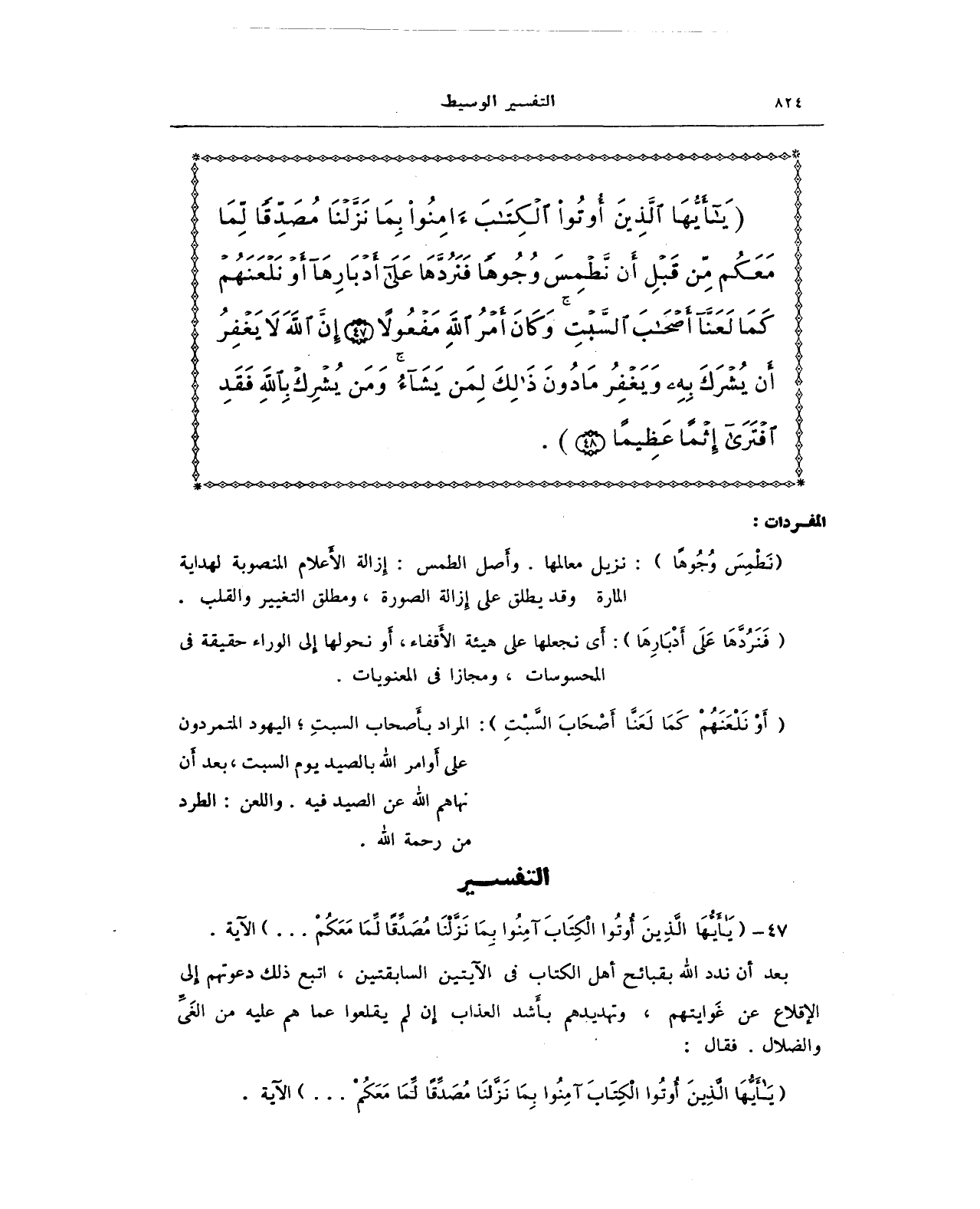 {يَا أَيُّهَا الَّذِينَ أُوتُوا الْكِتَابَ آمِنُوا بِمَا نَزَّلْنَا مُصَدِّقًا لِمَا مَعَكُمْ مِنْ قَبْلِ أَنْ نَطْمِسَ وُجُوهًا فَنَرُدَّهَا عَلَى أَدْبَارِهَا أَوْ نَلْعَنَهُمْ كَمَا لَعَنَّا أَصْحَابَ السَّبْتِ وَكَانَ أَمْرُ اللَّهِ مَفْعُولًا (47) إِنَّ اللَّهَ لَا يَغْفِرُ أَنْ يُشْرَكَ بِهِ وَيَغْفِرُ مَا دُونَ ذَلِكَ لِمَنْ يَشَاءُ وَمَنْ يُشْرِكْ بِاللَّهِ فَقَدِ افْتَرَى إِثْمًا عَظِيمًا (48)}.