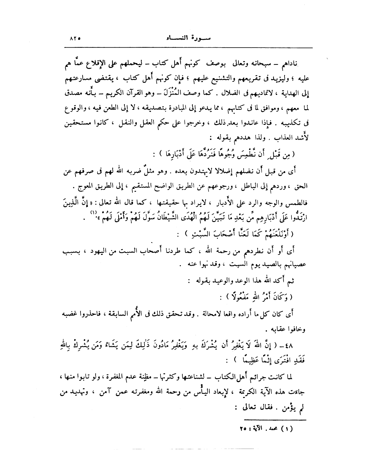 فالطمس والوجه والرد على الأدبار، لإيراد بها حقيقتها، كما قال الله تعالى: {إِنَّ الَّذِينَ ارْتَدُّوا عَلَى أَدْبَارِهِمْ مِنْ بَعْدِ مَا تَبَيَّنَ لَهُمُ الْهُدَى الشَّيْطَانُ سَوَّلَ لَهُمْ وَأَمْلَى لَهُمْ} (¬1).