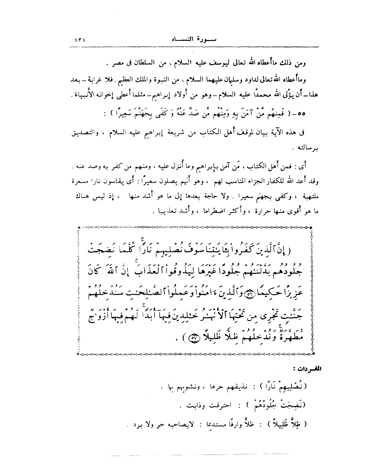 {إِنَّ الَّذِينَ كَفَرُوا بِآيَاتِنَا سَوْفَ نُصْلِيهِمْ نَارًا كُلَّمَا نَضِجَتْ جُلُودُهُمْ بَدَّلْنَاهُمْ جُلُودًا غَيْرَهَا لِيَذُوقُوا الْعَذَابَ إِنَّ اللهَ كَانَ عَزِيزًا حَكِيمًا (56) وَالَّذِينَ آمَنُوا وَعَمِلُوا الصَّالِحَاتِ سَنُدْخِلُهُمْ جَنَّاتٍ تَجْرِي مِنْ تَحْتِهَا الْأَنْهَارُ خَالِدِينَ فِيهَا أَبَدًا لَهُمْ فِيهَا أَزْوَاجٌ مُطَهَّرَةٌ وَنُدْخِلُهُمْ ظِلًّا ظَلِيلًا (57)}.