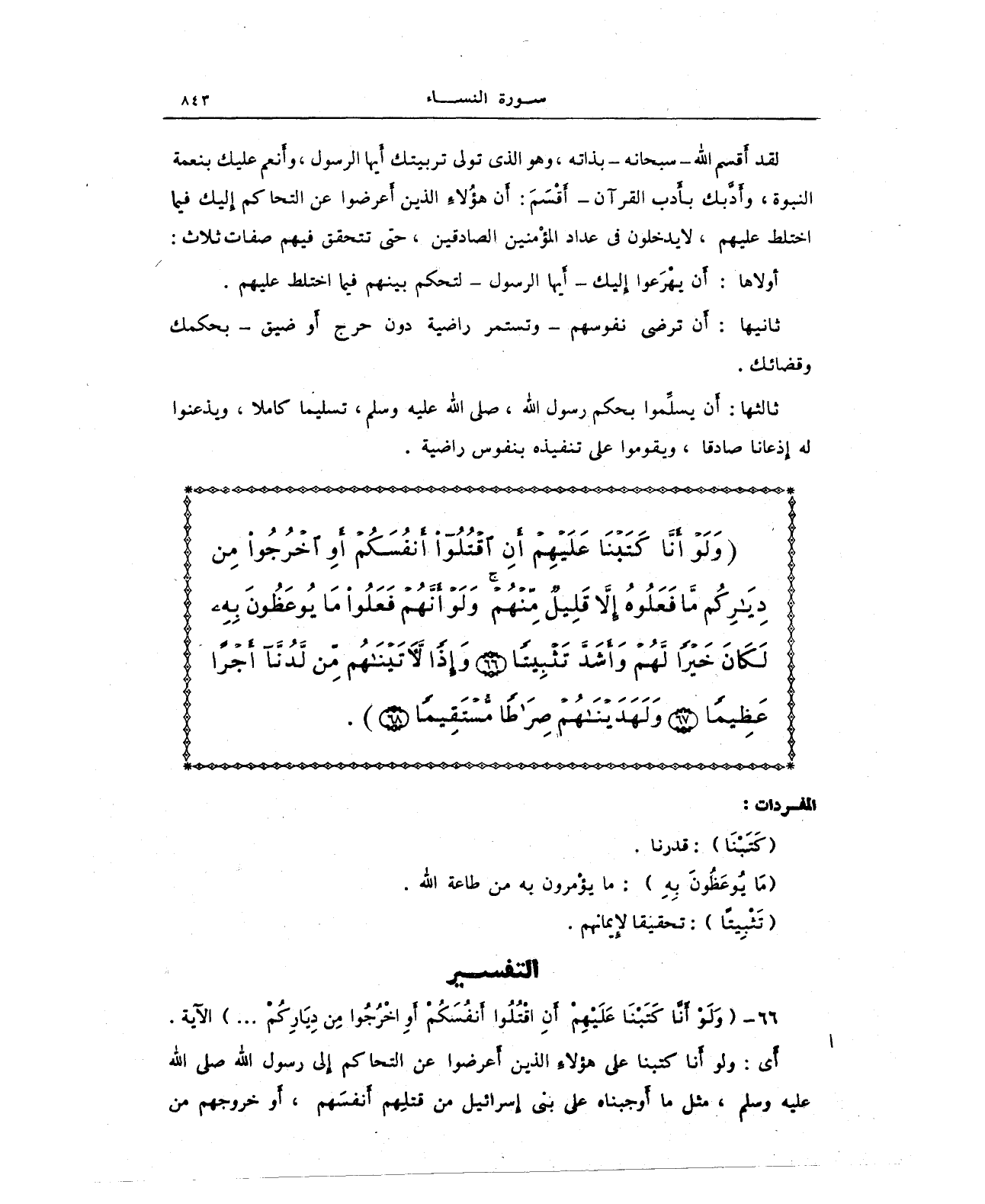 {وَلَوْ أَنَّا كَتَبْنَا عَلَيْهِمْ أَنِ اقْتُلُوا أَنْفُسَكُمْ أَوِ اخْرُجُوا مِنْ دِيَارِكُمْ مَا فَعَلُوهُ إِلَّا قَلِيلٌ مِنْهُمْ وَلَوْ أَنَّهُمْ فَعَلُوا مَا يُوعَظُونَ بِهِ لَكَانَ خَيْرًا لَهُمْ وَأَشَدَّ تَثْبِيتًا (66) وَإِذًا لَآتَيْنَاهُمْ مِنْ لَدُنَّا أَجْرًا عَظِيمًا (67) وَلَهَدَيْنَاهُمْ صِرَاطًا مُسْتَقِيمًا (68)}.