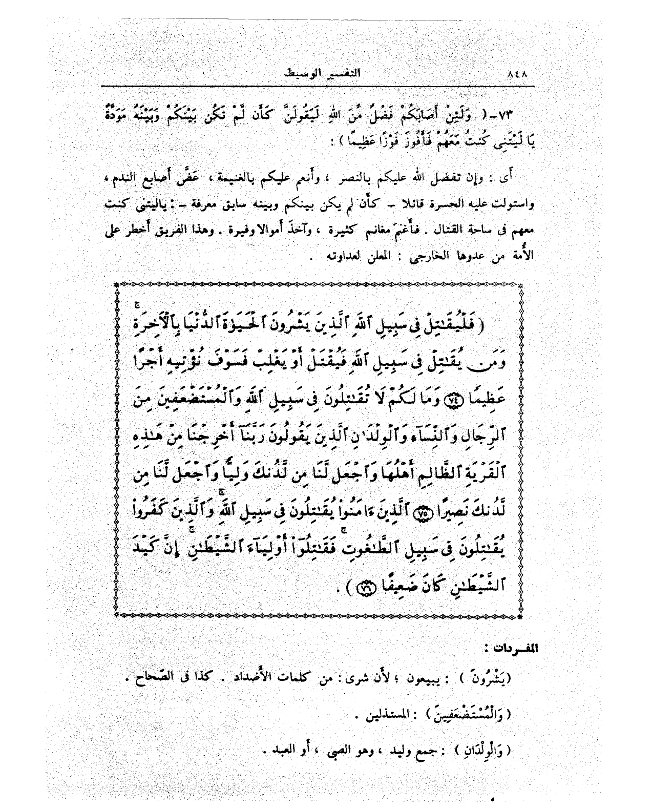 {فَلْيُقَاتِلْ فِي سَبِيلِ اللَّهِ الَّذِينَ يَشْرُونَ الْحَيَاةَ الدُّنْيَا بِالْآخِرَةِ وَمَنْ يُقَاتِلْ فِي سَبِيلِ اللَّهِ فَيُقْتَلْ أَوْ يَغْلِبْ فَسَوْفَ نُؤْتِيهِ أَجْرًا عَظِيمًا (74) وَمَا لَكُمْ لَا تُقَاتِلُونَ فِي سَبِيلِ اللَّهِ وَالْمُسْتَضْعَفِينَ مِنَ الرِّجَالِ وَالنِّسَاءِ وَالْوِلْدَانِ الَّذِينَ يَقُولُونَ رَبَّنَا أَخْرِجْنَا مِنْ هَذِهِ الْقَرْيَةِ الظَّالِمِ أَهْلُهَا وَاجْعَلْ لَنَا مِنْ لَدُنْكَ وَلِيًّا وَاجْعَلْ لَنَا مِنْ لَدُنْكَ نَصِيرًا (75) الَّذِينَ آمَنُوا يُقَاتِلُونَ فِي سَبِيلِ اللَّهِ وَالَّذِينَ كَفَرُوا يُقَاتِلُونَ فِي سَبِيلِ الطَّاغُوتِ فَقَاتِلُوا أَوْلِيَاءَ الشَّيْطَانِ إِنَّ كَيْدَ الشَّيْطَانِ كَانَ ضَعِيفًا (76)}.