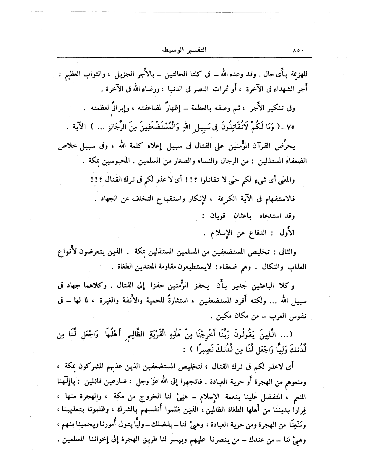 وكلا الباعثين جدير بأن يحفز المؤمنين حفزا إلى القتال. وكلاهما جهاد في سبيل الله ... ولكنه أفرد المستضعفين، استثارةً للحمية والأنفة والغيرة، لما لها - في نفوس العرب - من مكان مكين.