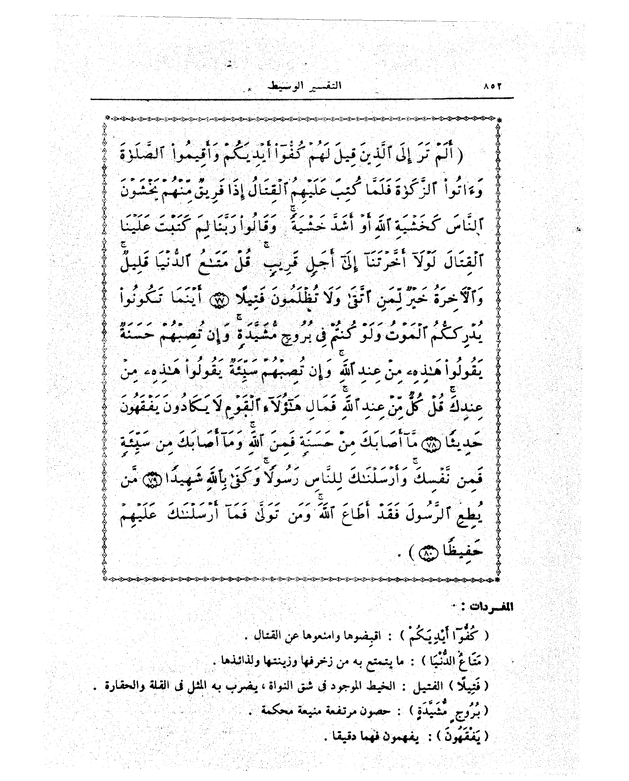 {أَلَمْ تَرَ إِلَى الَّذِينَ قِيلَ لَهُمْ كُفُّوا أَيْدِيَكُمْ وَأَقِيمُوا الصَّلَاةَ وَآتُوا الزَّكَاةَ فَلَمَّا كُتِبَ عَلَيْهِمُ الْقِتَالُ إِذَا فَرِيقٌ مِنْهُمْ يَخْشَوْنَ النَّاسَ كَخَشْيَةِ اللَّهِ أَوْ أَشَدَّ خَشْيَةً وَقَالُوا رَبَّنَا لِمَ كَتَبْتَ عَلَيْنَا الْقِتَالَ لَوْلَا أَخَّرْتَنَا إِلَى أَجَلٍ قَرِيبٍ قُلْ مَتَاعُ الدُّنْيَا قَلِيلٌ وَالْآخِرَةُ خَيْرٌ لِمَنِ اتَّقَى وَلَا تُظْلَمُونَ فَتِيلًا (77) أَيْنَمَا تَكُونُوا يُدْرِكْكُمُ الْمَوْتُ وَلَوْ كُنْتُمْ فِي بُرُوجٍ مُشَيَّدَةٍ وَإِنْ تُصِبْهُمْ حَسَنَةٌ يَقُولُوا هَذِهِ مِنْ عِنْدِ اللَّهِ وَإِنْ تُصِبْهُمْ سَيِّئَةٌ يَقُولُوا هَذِهِ مِنْ عِنْدِكَ قُلْ كُلٌّ مِنْ عِنْدِ اللَّهِ فَمَالِ هَؤُلَاءِ الْقَوْمِ لَا يَكَادُونَ يَفْقَهُونَ حَدِيثًا (78) مَا أَصَابَكَ مِنْ حَسَنَةٍ فَمِنَ اللَّهِ وَمَا أَصَابَكَ مِنْ سَيِّئَةٍ فَمِنْ نَفْسِكَ وَأَرْسَلْنَاكَ لِلنَّاسِ رَسُولًا وَكَفَى بِاللَّهِ شَهِيدًا (79) مَنْ يُطِعِ الرَّسُولَ فَقَدْ أَطَاعَ اللَّهَ وَمَنْ تَوَلَّى فَمَا أَرْسَلْنَاكَ عَلَيْهِمْ حَفِيظًا (80)}.