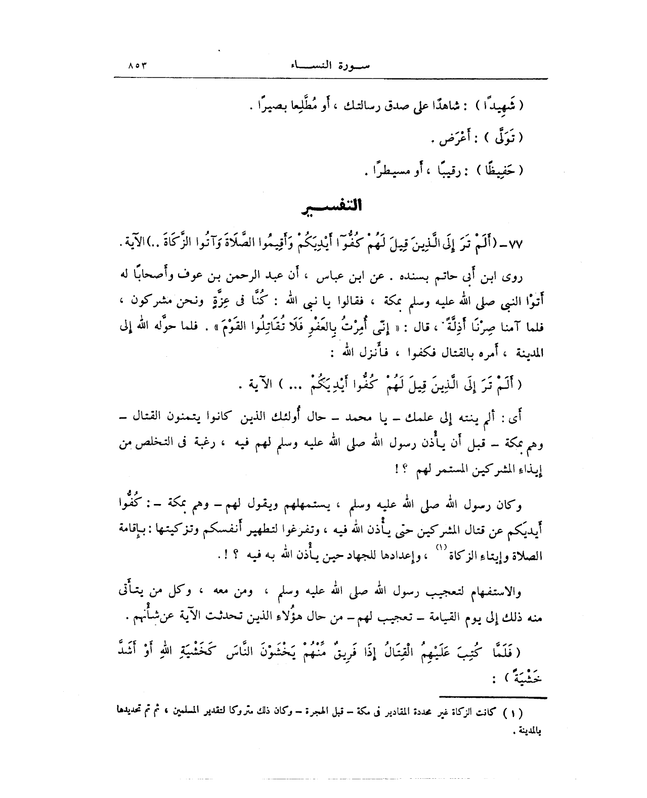 77 - {أَلَمْ تَرَ إِلَى الَّذِينَ قِيلَ لَهُمْ كُفُّوا أَيْدِيَكُمْ وَأَقِيمُوا الصَّلَاةَ وَآتُوا الزَّكَاةَ} الآية.