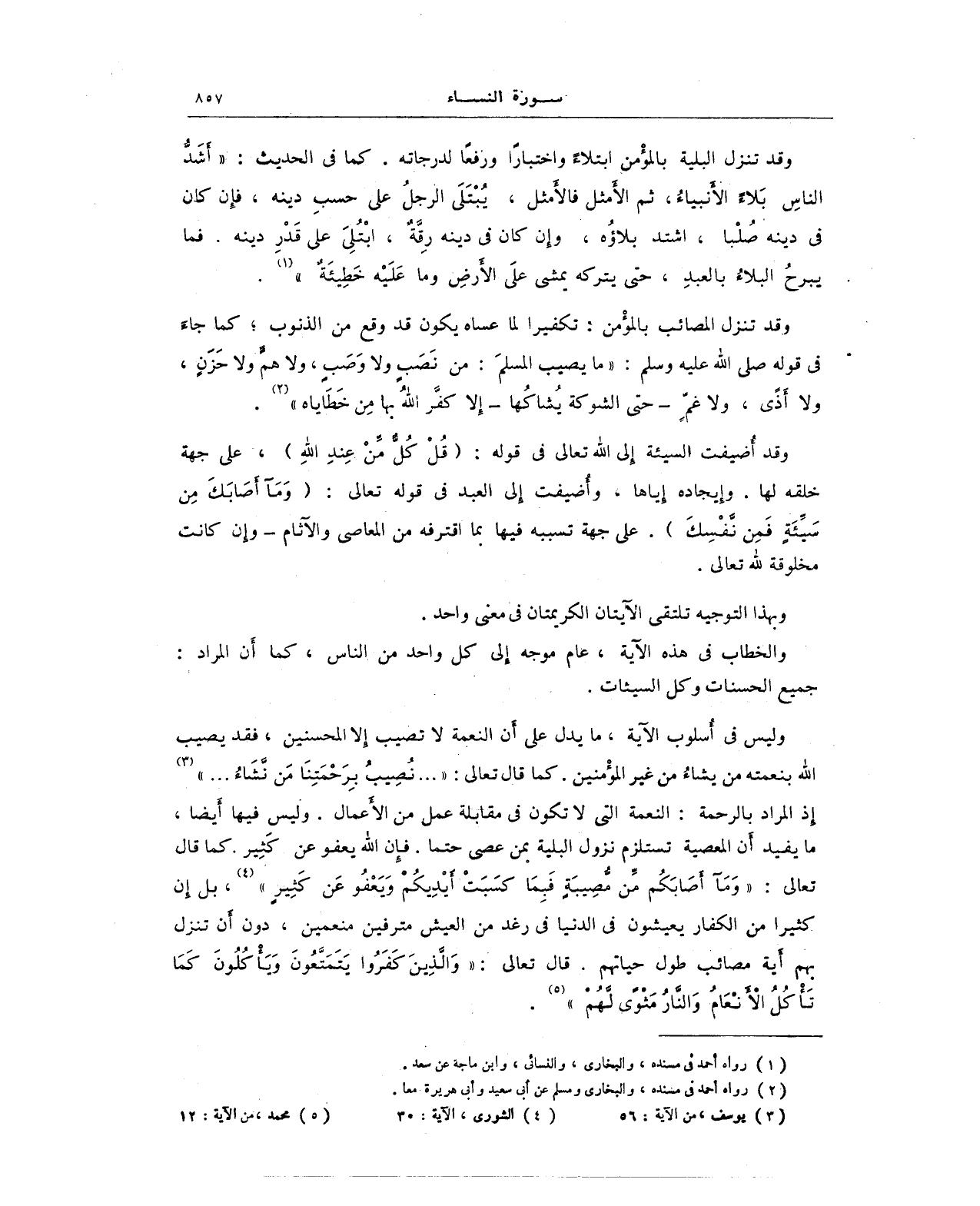 وليس في أسلوب الآية، ما يدل على أَن النعمة لا تصيب إلا المحسنين، فقد يصيب الله بنعمته من يشاء من غير المؤْمنين. كما قال تعالى: { ... نُصِيبُ بِرَحْمَتِنَا مَن نَّشَاءُ ... } (¬3) إذ المراد بالرحمة: النعمة التي لا تكون في مقابلة عمل من الأعمال. وليس فيها أَيضا، ما يفيد أَن المعصية تستلزم نزول البلية ممن عصى حتما. فإِن الله يعفو عن كَثِير. كما قال تعالى: {وَمَا أَصَابَكُمْ مِنْ مُصِيبَةٍ فَبِمَا كَسَبَتْ أَيْدِيكُمْ وَيَعْفُو عَنْ كَثِيرٍ} (¬4)، بل إن كثيرا من الكفار يعيشون في الدنيا في رغد من العيش مترفين منعمين، دون أن تنزل بهم أية مصائب طول حياتهم. قال تعالى: {وَالَّذِينَ كَفَرُوا يَتَمَتَّعُونَ وَيَأْكُلُونَ كَمَا تَأْكُلُ الْأَنْعَامُ وَالنَّارُ مَثْوًى لَهُمْ} (¬5).
