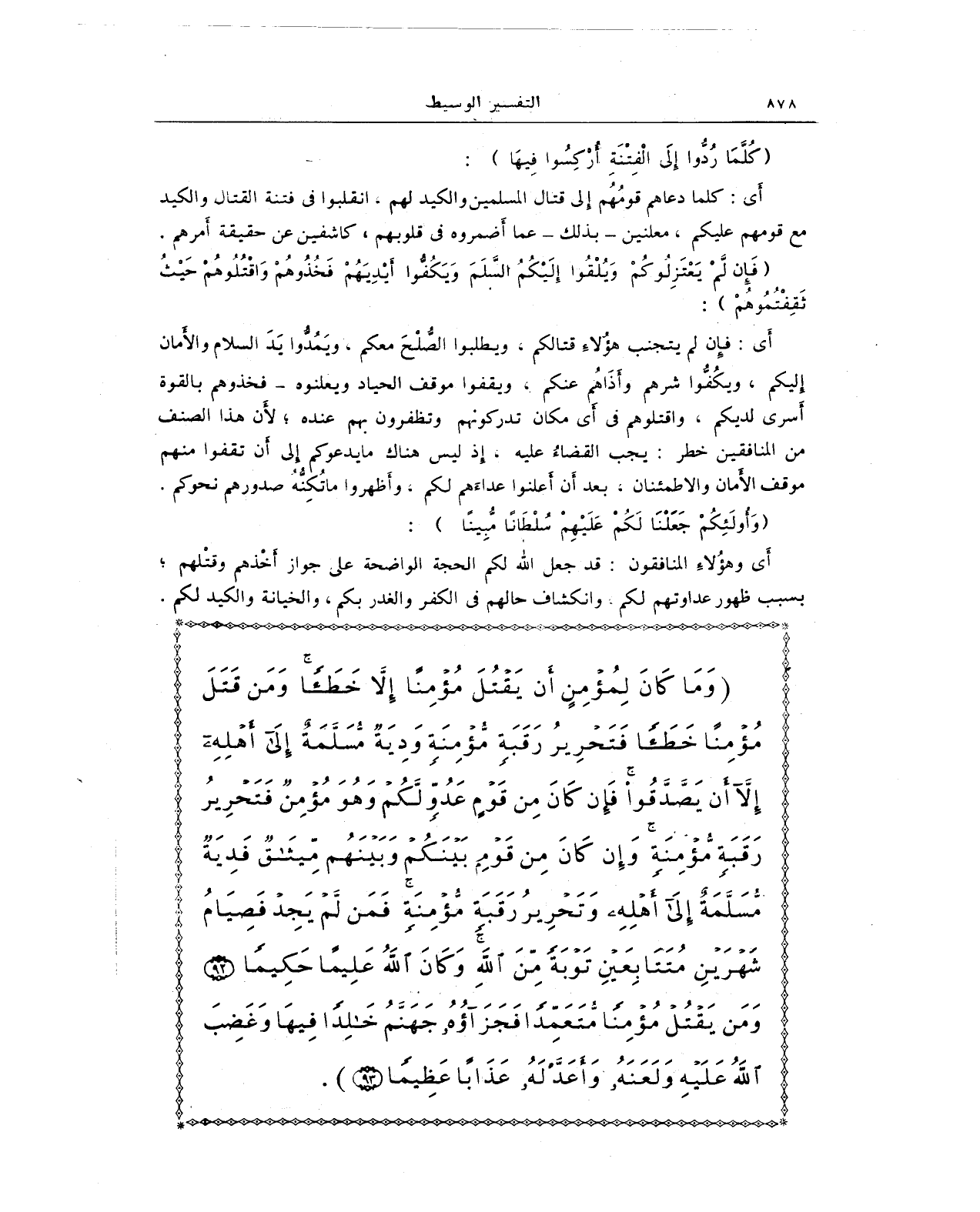 {وَمَا كَانَ لِمُؤْمِنٍ أَنْ يَقْتُلَ مُؤْمِنًا إِلَّا خَطَأً وَمَنْ قَتَلَ مُؤْمِنًا خَطَأً فَتَحْرِيرُ رَقَبَةٍ مُؤْمِنَةٍ وَدِيَةٌ مُسَلَّمَةٌ إِلَى أَهْلِهِ إِلَّا أَنْ يَصَّدَّقُوا فَإِنْ كَانَ مِنْ قَوْمٍ عَدُوٍّ لَكُمْ وَهُوَ مُؤْمِنٌ فَتَحْرِيرُ رَقَبَةٍ مُؤْمِنَةٍ وَإِنْ كَانَ مِنْ قَوْمٍ بَيْنَكُمْ وَبَيْنَهُمْ مِيثَاقٌ فَدِيَةٌ مُسَلَّمَةٌ إِلَى أَهْلِهِ وَتَحْرِيرُ رَقَبَةٍ مُؤْمِنَةٍ فَمَنْ لَمْ يَجِدْ فَصِيَامُ شَهْرَيْنِ مُتَتَابِعَيْنِ تَوْبَةً مِنَ اللَّهِ وَكَانَ اللَّهُ عَلِيمًا حَكِيمًا (92) وَمَنْ يَقْتُلْ مُؤْمِنًا مُتَعَمِّدًا فَجَزَاؤُهُ جَهَنَّمُ خَالِدًا فِيهَا وَغَضِبَ اللَّهُ عَلَيْهِ وَلَعَنَهُ وَأَعَدَّ لَهُ عَذَابًا عَظِيمًا (93)}.