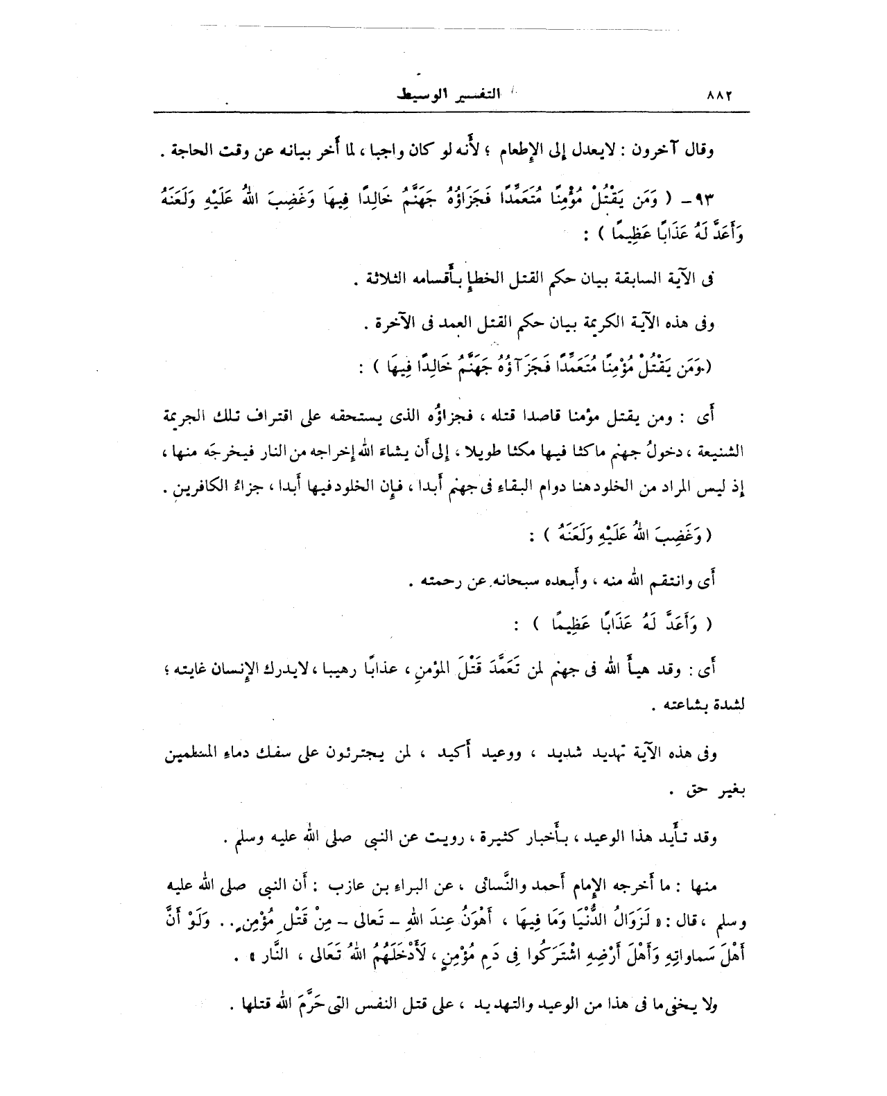 93 - {وَمَنْ يَقْتُلْ مُؤْمِنًا مُتَعَمِّدًا فَجَزَاؤُهُ جَهَنَّمُ خَالِدًا فِيهَا وَغَضِبَ اللَّهُ عَلَيْهِ وَلَعَنَهُ وَأَعَدَّ لَهُ عَذَابًا عَظِيمًا}: