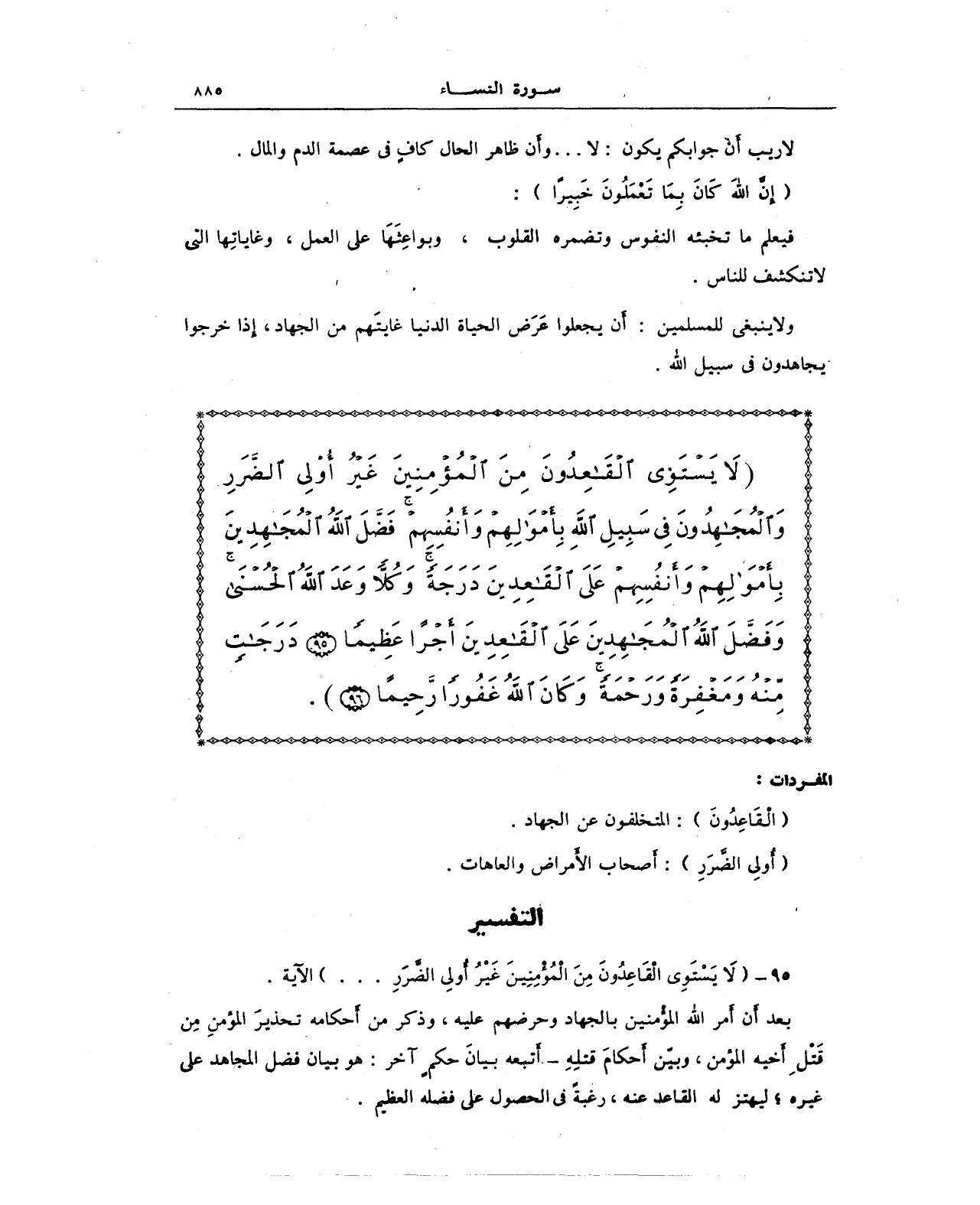 {لَا يَسْتَوِي الْقَاعِدُونَ مِنَ الْمُؤْمِنِينَ غَيْرُ أُولِي الضَّرَرِ وَالْمُجَاهِدُونَ فِي سَبِيلِ اللَّهِ بِأَمْوَالِهِمْ وَأَنْفُسِهِمْ فَضَّلَ اللَّهُ الْمُجَاهِدِينَ بِأَمْوَالِهِمْ وَأَنْفُسِهِمْ عَلَى الْقَاعِدِينَ دَرَجَةً وَكُلًّا وَعَدَ اللَّهُ الْحُسْنَى وَفَضَّلَ اللَّهُ الْمُجَاهِدِينَ عَلَى الْقَاعِدِينَ أَجْرًا عَظِيمًا (95) دَرَجَاتٍ مِنْهُ وَمَغْفِرَةً وَرَحْمَةً وَكَانَ اللَّهُ غَفُورًا رَحِيمًا (96)}.