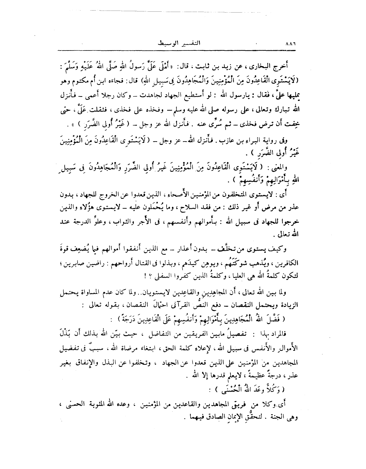 والمعنى: {لَا يَسْتَوِي الْقَاعِدُونَ مِنَ الْمُؤْمِنِينَ غَيْرُ أُولِي الضَّرَرِ وَالْمُجَاهِدُونَ فِي سَبِيلِ اللَّهِ بِأَمْوَالِهِمْ وَأَنْفُسِهِمْ}.