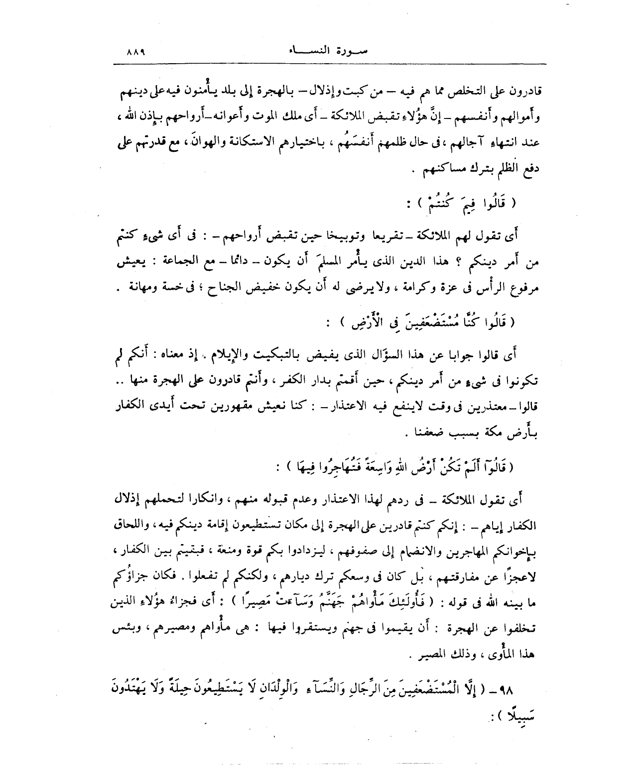 قادرون على التخلص مما هم فيه - من كبت وإِذلال - بالهجرة إلى بلد يأمنون فيه على دينهم وأموالهم وأنفسهم - إنَّ هؤُلاءِ تقبض الملائكة - أي ملك الموت وأعوانه - أَرواحهم بإذن الله، عند انتهاءِ آجالهم، في حال ظلمهم أَنفسَهُم، باختيارهم الاستكانة والهوانَ، مع قدرتهم على دفع الظلم بترك مساكنهم.