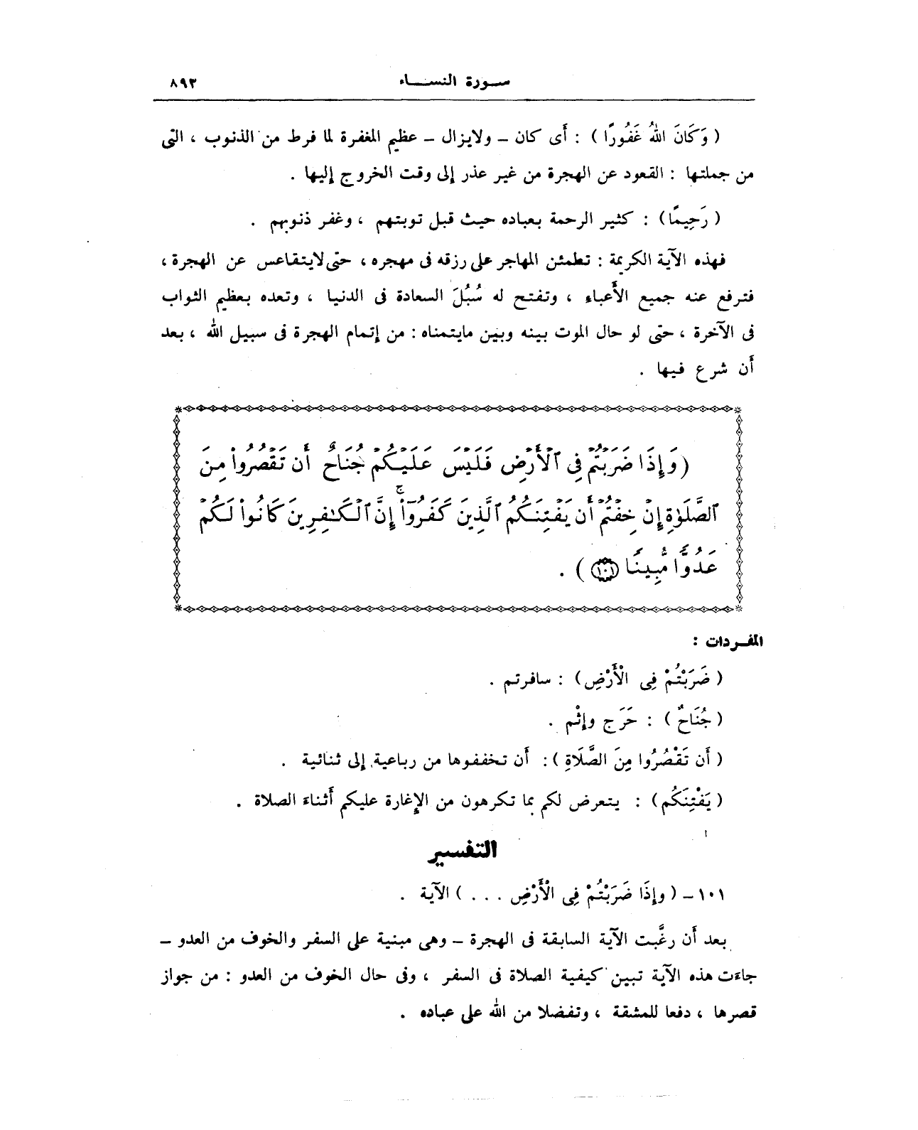 {وَإِذَا ضَرَبْتُمْ فِي الْأَرْضِ فَلَيْسَ عَلَيْكُمْ جُنَاحٌ أَنْ تَقْصُرُوا مِنَ الصَّلَاةِ إِنْ خِفْتُمْ أَنْ يَفْتِنَكُمُ الَّذِينَ كَفَرُوا إِنَّ الْكَافِرِينَ كَانُوا لَكُمْ عَدُوًّا مُبِينًا (101)}.