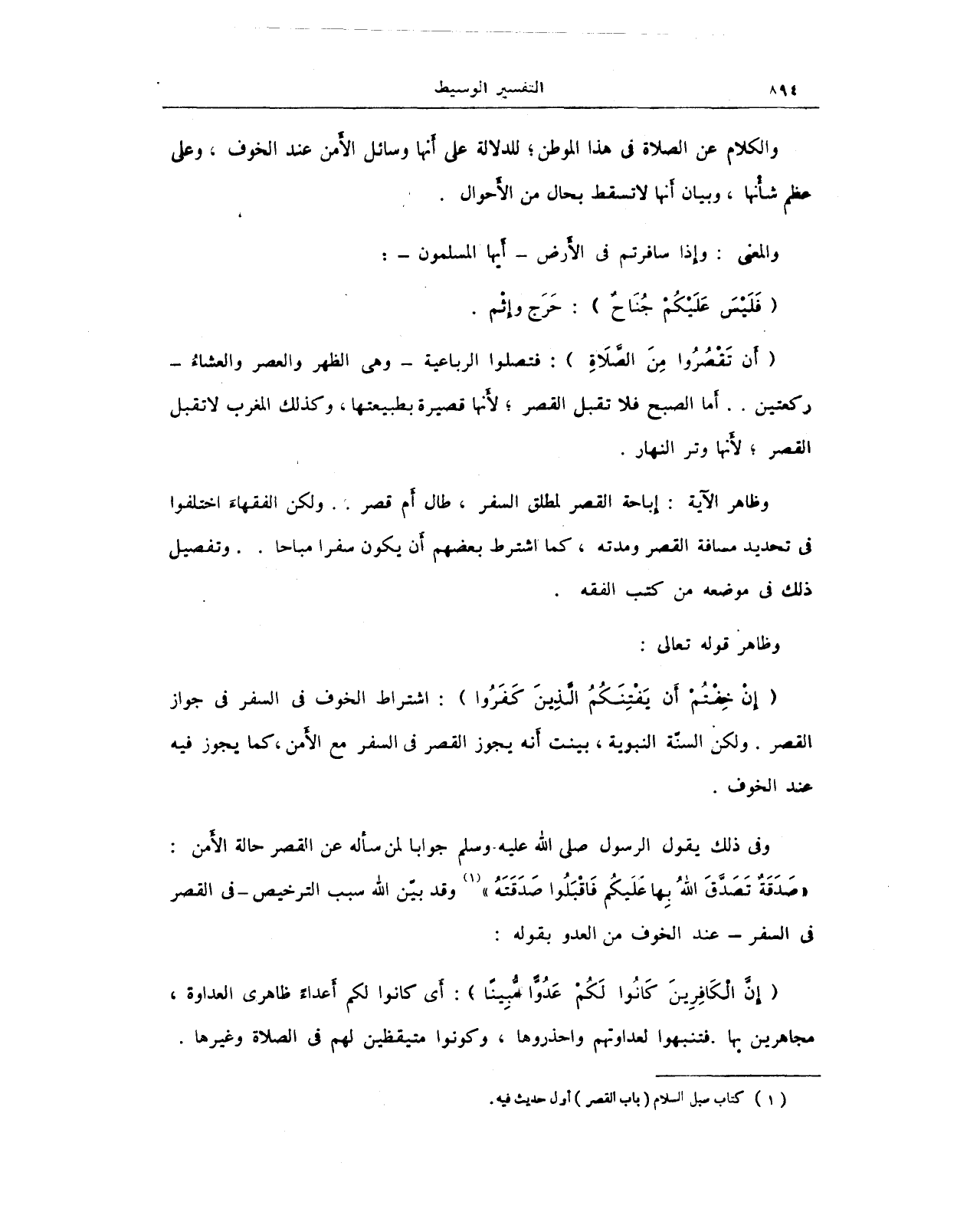 {إِنْ خِفْتُمْ أَنْ يَفْتِنَكُمُ الَّذِينَ كَفَرُوا}: اشتراط الخوف في السفر في جواز القصر. ولكن السنّة النبوية، بينت أنه يجوز القصر في السفر مع الأمن، كما يجوز فيه عند الخوف.