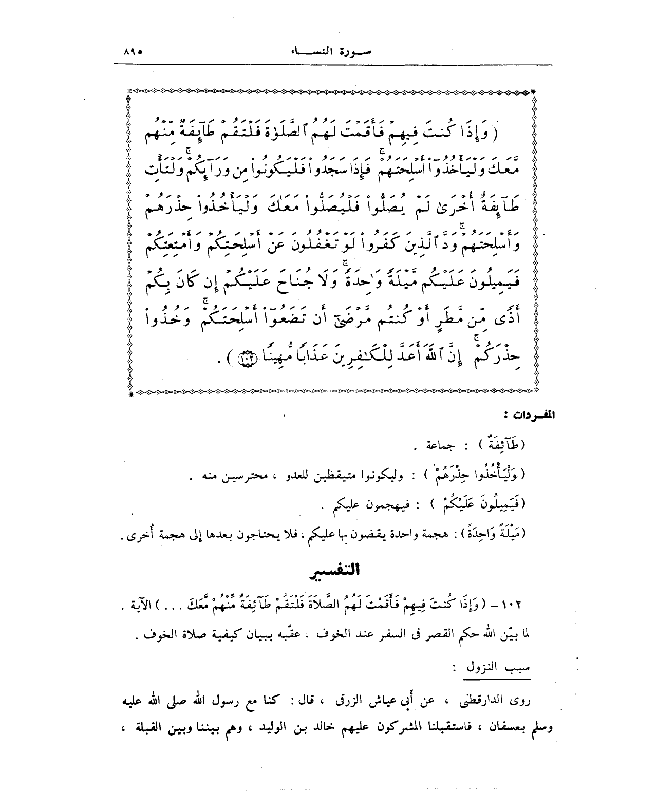 {وَإِذَا كُنْتَ فِيهِمْ فَأَقَمْتَ لَهُمُ الصَّلَاةَ فَلْتَقُمْ طَائِفَةٌ مِنْهُمْ مَعَكَ وَلْيَأْخُذُوا أَسْلِحَتَهُمْ فَإِذَا سَجَدُوا فَلْيَكُونُوا مِنْ وَرَائِكُمْ وَلْتَأْتِ طَائِفَةٌ أُخْرَى لَمْ يُصَلُّوا فَلْيُصَلُّوا مَعَكَ وَلْيَأْخُذُوا حِذْرَهُمْ وَأَسْلِحَتَهُمْ وَدَّ الَّذِينَ كَفَرُوا لَوْ تَغْفُلُونَ عَنْ أَسْلِحَتِكُمْ وَأَمْتِعَتِكُمْ فَيَمِيلُونَ عَلَيْكُمْ مَيْلَةً وَاحِدَةً وَلَا جُنَاحَ عَلَيْكُمْ إِنْ كَانَ بِكُمْ أَذًى مِنْ مَطَرٍ أَوْ كُنْتُمْ مَرْضَى أَنْ تَضَعُوا أَسْلِحَتَكُمْ وَخُذُوا حِذْرَكُمْ إِنَّ اللَّهَ أَعَدَّ لِلْكَافِرِينَ عَذَابًا مُهِينًا (102)}.