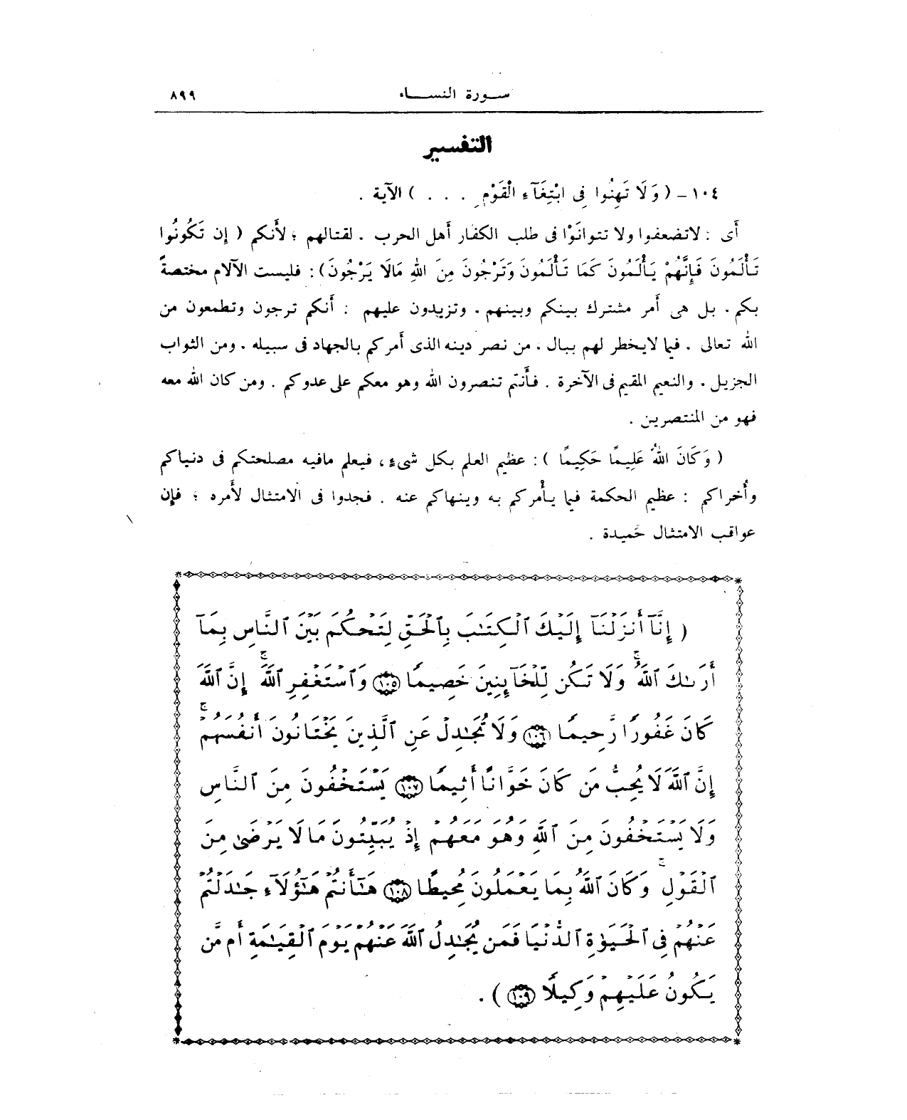 {إِنَّا أَنْزَلْنَا إِلَيْكَ الْكِتَابَ بِالْحَقِّ لِتَحْكُمَ بَيْنَ النَّاسِ بِمَا أَرَاكَ اللَّهُ وَلَا تَكُنْ لِلْخَائِنِينَ خَصِيمًا (105) وَاسْتَغْفِرِ اللَّهَ إِنَّ اللَّهَ كَانَ غَفُورًا رَحِيمًا (106) وَلَا تُجَادِلْ عَنِ الَّذِينَ يَخْتَانُونَ أَنْفُسَهُمْ إِنَّ اللَّهَ لَا يُحِبُّ مَنْ كَانَ خَوَّانًا أَثِيمًا (107) يَسْتَخْفُونَ مِنَ النَّاسِ وَلَا يَسْتَخْفُونَ مِنَ اللَّهِ وَهُوَ مَعَهُمْ إِذْ يُبَيِّتُونَ مَا لَا يَرْضَى مِنَ الْقَوْلِ وَكَانَ اللَّهُ بِمَا يَعْمَلُونَ مُحِيطًا (108) هَا أَنْتُمْ هَؤُلَاءِ جَادَلْتُمْ عَنْهُمْ فِي الْحَيَاةِ الدُّنْيَا فَمَنْ يُجَادِلُ اللَّهَ عَنْهُمْ يَوْمَ الْقِيَامَةِ أَمْ مَنْ يَكُونُ عَلَيْهِمْ وَكِيلًا (109)}.