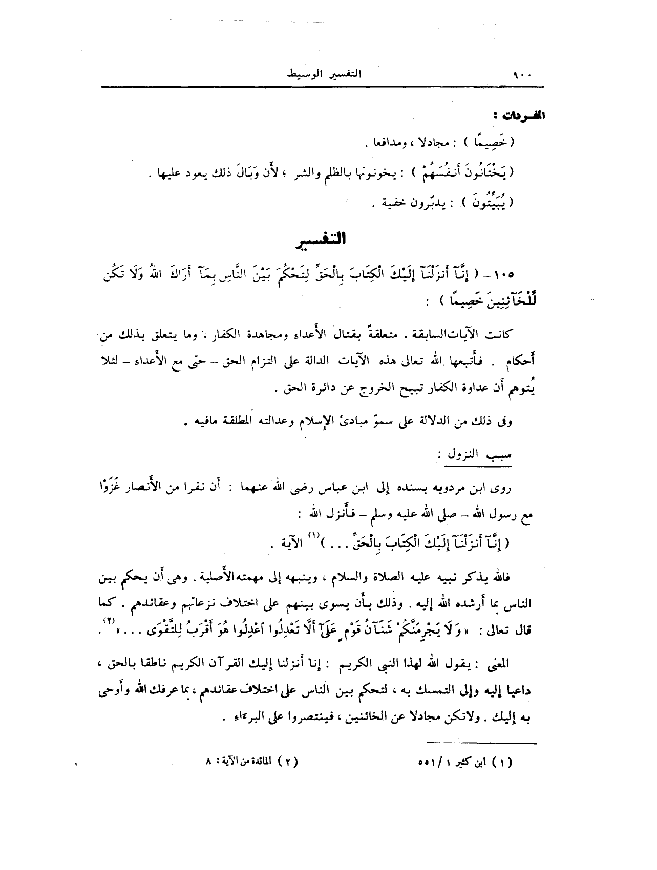 المعنى: يقول الله لهذا النبي الكريم: إِنا أَنزلنا إِليك القرآن الكريم ناطقا بالحق، داعيا إليه وإِلى التمسك به، لتحكم بين الناس على اختلاف عقائدهم. بما عرفك الله وأَوحى به إليك. ولا تكن مجادلًا عن الخائنين، فينتصروا على البرءَاءِ.