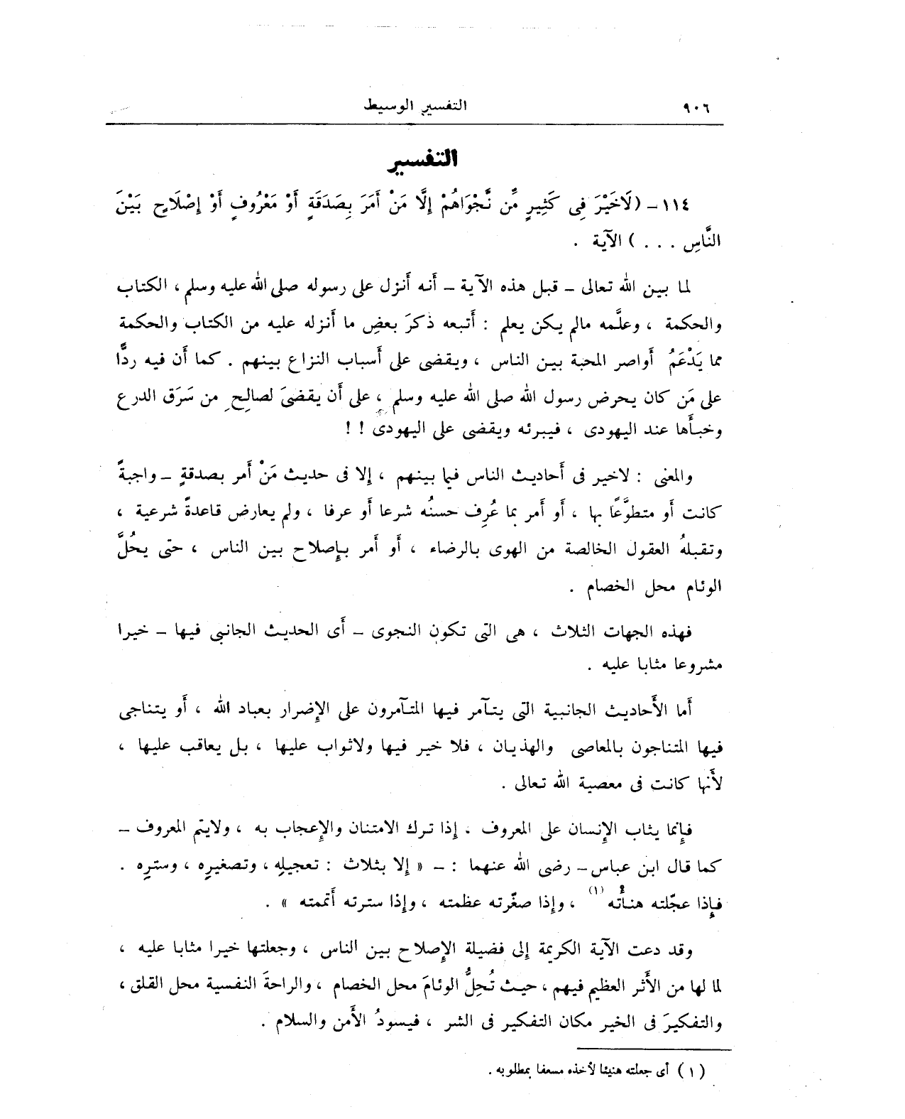 114 - {لَا خَيْرَ فِي كَثِيرٍ مِنْ نَجْوَاهُمْ إِلَّا مَنْ أَمَرَ بِصَدَقَةٍ أَوْ مَعْرُوفٍ أَوْ إِصْلَاحٍ بَيْنَ النَّاسِ ... } الآية.