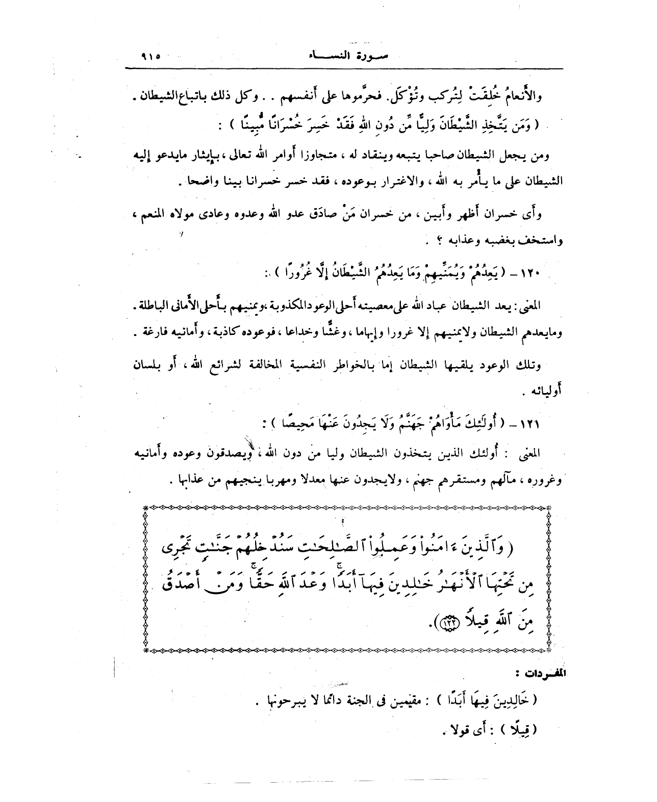 المعنى: أولئك الذين يتخذون الشيطان وليا من دون الله، ويصدقون وعوده وأمانيه وغروره، مآلهم ومستقرهم جهنم، ولا يجدون عنها معدلا ومهربا ينجيهم من عذابها.