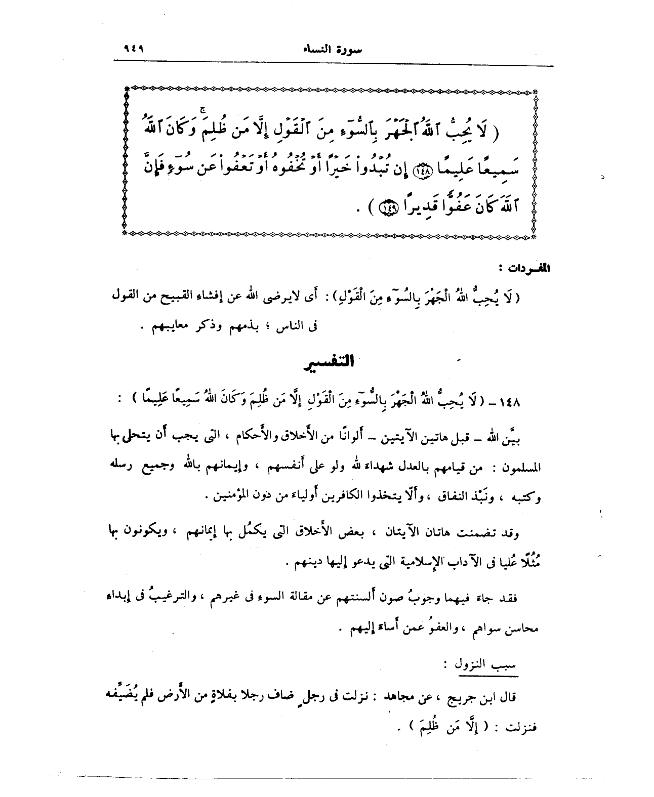 {لَا يُحِبُّ اللهُ الْجَهْرَ بِالسُّوءِ مِنَ الْقَوْلِ إِلَّا مَنْ ظُلِمَ وَكَانَ اللهُ سَمِيعًا عَلِيمًا (148) إِنْ تُبْدُوا خَيْرًا أَوْ تُخْفُوهُ أَوْ تَعْفُوا عَنْ سُوءٍ فَإِنَّ اللهَ كَانَ عَفُوًّا قَدِيرًا (149)}.