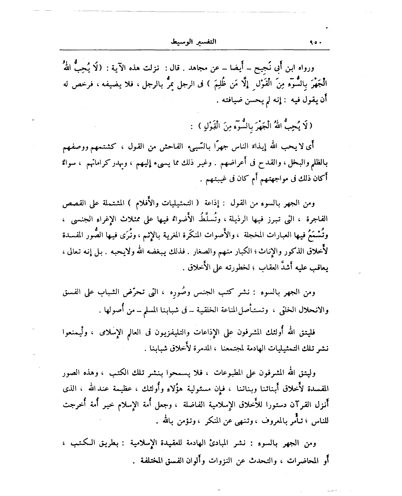 ومن الجهر بالسوءِ من القول: إذاعة (التمثيليات والأَفلام) المشتملة على القصص الفاجرة، التي تبرز فيها الرذيلة، وتُسلَّطُ الأَضواءُ فيها على ممثلاث الإغراء الجنسي، وتُسْمَعُ فيها العبارات المخجلة، والأَصوات المنكَرة المغرية بالإثم، وتُرَى فيها الصور المفسدة لأَخلاق الذكور والأناث؛ الكبار منهم والصغار. فذلك يبغضه الله ولا يحبه. بل إنه تعالى، يعاقب عليه أَشدَّ العقاب؛ لخطورته على الأخلاق.