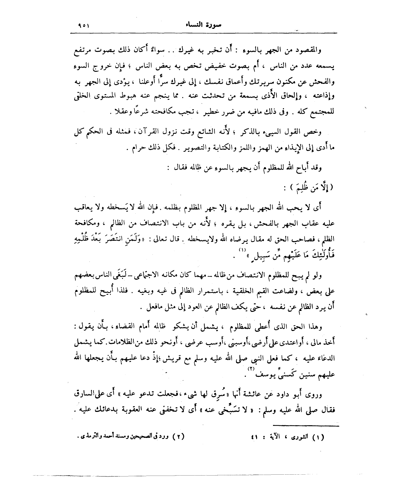 أَي لا يحب الله الجهر بالسوءِ، إلا جهر المظلوم بظلمه. فإِن الله لا يَسخطه ولا يعاقب عليه عقاب الجهر بالفحش، بل يقره؛ لأنه من باب الانتصاف من الظالم، ومكافحة الظلم، فصاحب الحق له مقال يرضاه الله ولا يسخطه. قال تعالى: "وَلَمَنِ انتَصَرَ بَعْدَ ظُلْمِهِ فَأُوَلئِكَ مَا عَلَيْهِم مِّن سَبيل" (¬1).