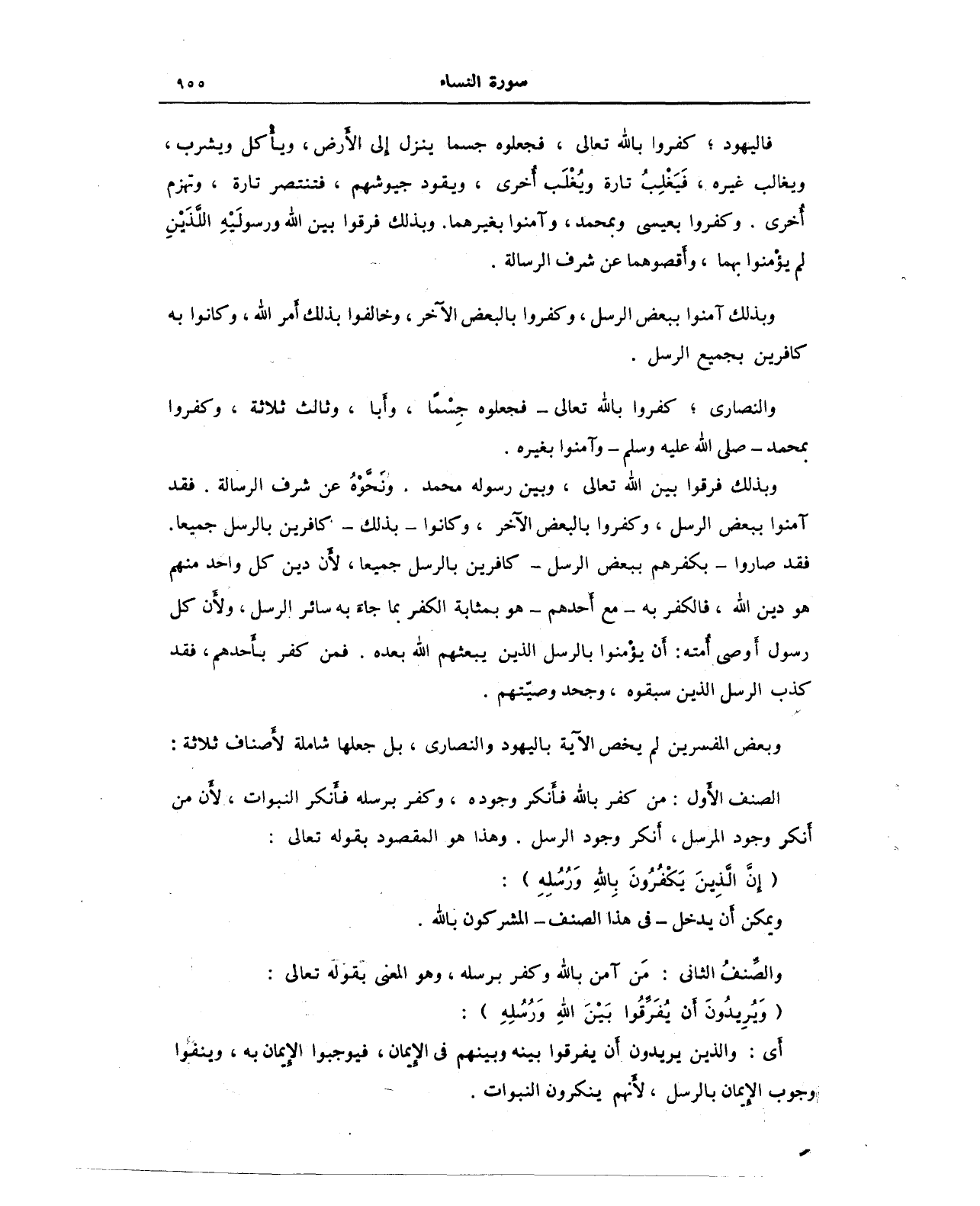 فاليهود؛ كفروا باللهِ تعالى، فجعلوه جسما ينزل إلى الأرض، ويأْكل ويشرب، ويغالب غيره، فَيَغْلِبُ تارة ويُغْلَب أخرى، ويقود جيوشهم، فتنتصر تارة، وتهزم أُخرى. وكفروا بعيسى وبمحمد، وآمنوا بغيرهما. وبذلك فرقوا بين الله ورسولَيْهِ اللذَيْنِ لم يؤْمنوا بهما، وأَقصوهما عن شرف الرسالة.