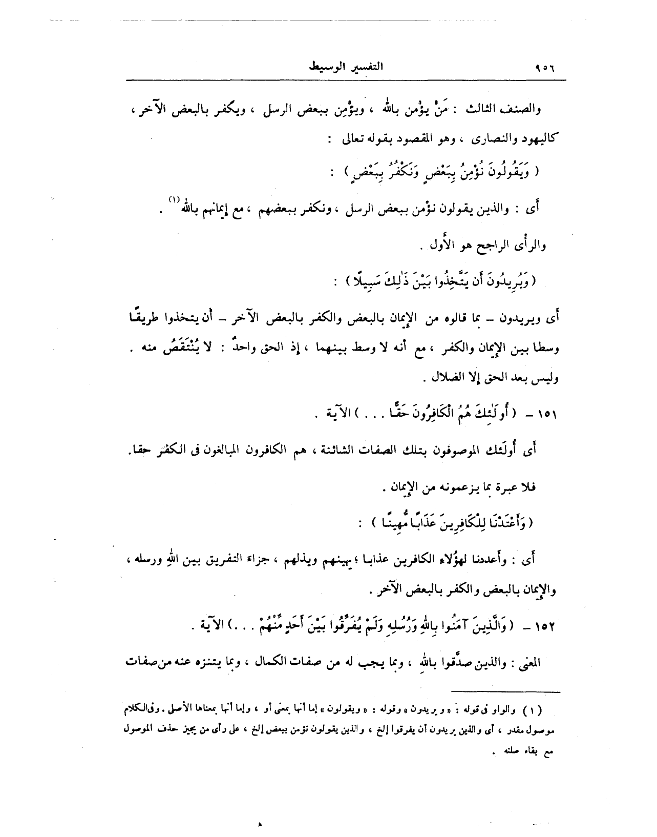 (¬1) والواو في قوله: "ويريدون" وقوله: "ويقولون" إما أنها بمعنى أو، وإما أنها بمعناها الأصلي. وفي الكلام موصول مقدر، أي والذين يريدون أن يفرقوا إلخ، والذين يقولون نؤمن ببعض إلخ، على رأي من يجيز حذف الموصول مع بقاه صلته.