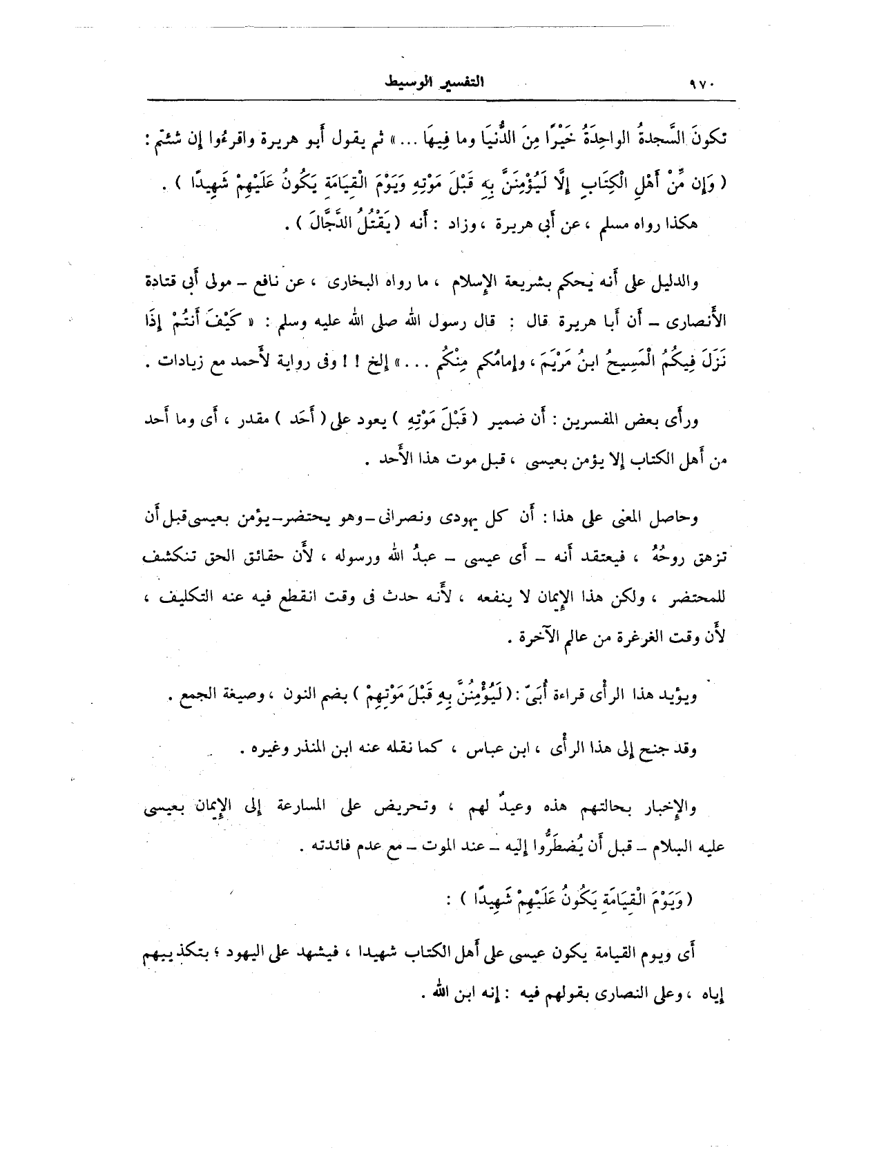 تكونَ السَّجدةُ الواحِدَةُ خَيْرا مِنَ الدُّنيَا وما فِيهَا ... " ثم يقول أَبو هريرة واقرءُوا إِن شئتم: (وَإِنْ مِنْ أَهْلِ الْكِتَابِ إِلَّا لَيُؤْمِنَنَّ بِهِ قَبْلَ مَوْتِهِ وَيَوْمَ الْقِيَامَةِ يَكُونُ عَلَيْهِمْ شَهِيدًا).