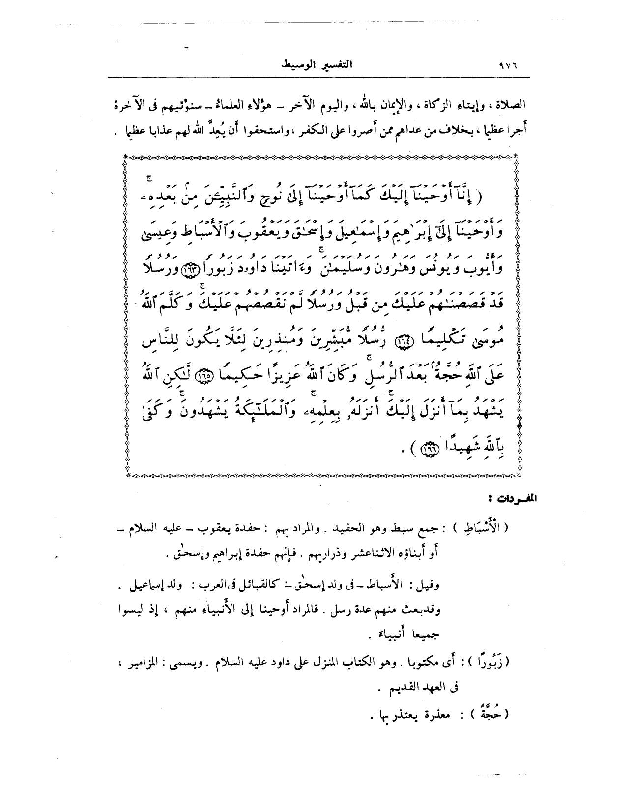 {إِنَّا أَوْحَيْنَا إِلَيْكَ كَمَا أَوْحَيْنَا إِلَى نُوحٍ وَالنَّبِيِّينَ مِنْ بَعْدِهِ وَأَوْحَيْنَا إِلَى إِبْرَاهِيمَ وَإِسْمَاعِيلَ وَإِسْحَاقَ وَيَعْقُوبَ وَالْأَسْبَاطِ وَعِيسَى وَأَيُّوبَ وَيُونُسَ وَهَارُونَ وَسُلَيْمَانَ وَآتَيْنَا دَاوُودَ زَبُورًا (163) وَرُسُلًا قَدْ قَصَصْنَاهُمْ عَلَيْكَ مِنْ قَبْلُ وَرُسُلًا لَمْ نَقْصُصْهُمْ عَلَيْكَ وَكَلَّمَ اللهُ مُوسَى تَكْلِيمًا (164) رُسُلًا مُبَشِّرِينَ وَمُنْذِرِينَ لِئَلَّا يَكُونَ لِلنَّاسِ عَلَى اللهِ حُجَّةٌ بَعْدَ الرُّسُلِ وَكَانَ اللهُ عَزِيزًا حَكِيمًا (165) لَكِنِ اللهُ يَشْهَدُ بِمَا أَنْزَلَ إِلَيْكَ أَنْزَلَهُ بِعِلْمِهِ وَالْمَلَائِكَةُ يَشْهَدُونَ وَكَفَى بِاللهِ شَهِيدًا (166)}.