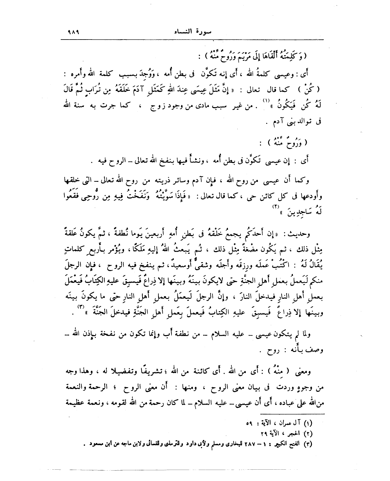 أَي: وعيسى كلمةُ الله، أَي إِنه تَكوَّن في بطن أُمه، وَوُجِدَ بسبب كلمة الله وأَمره: (كُنْ) كما قال تعالى: {إِنَّ مَثَلَ عِيسَى عِنْدَ اللهِ كَمَثَلِ آدَمَ خَلَقَهُ مِنْ تُرَابٍ ثُمَّ قَالَ لَهُ كُنْ فَيَكُونُ (59)}. (¬1) من غير سبب مادي من وجود زوج، كما جرت به سنة الله في توالد بني آدم.