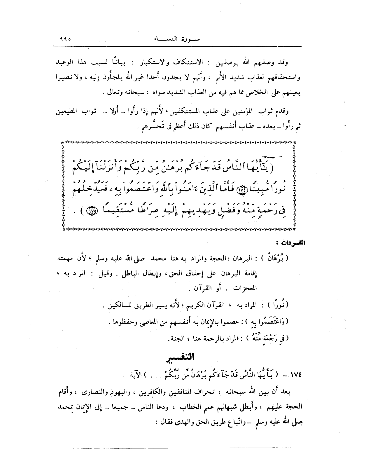 (يَا أَيُّهَا النَّاسُ قَدْ جَاءَكُمْ بُرْهَانٌ مِنْ رَبِّكُمْ وَأَنْزَلْنَا إِلَيْكُمْ نُورًا مُبِينًا (174) فَأَمَّا الَّذِينَ آمَنُوا بِاللهِ وَاعْتَصَمُوا بِهِ فَسَيُدْخِلُهُمْ في رَحْمَةٍ مِنْهُ وَفَضْلٍ وَيَهْدِيهِمْ إِلَيْهِ صِرَاطًا مُسْتَقِيمًا (175)).