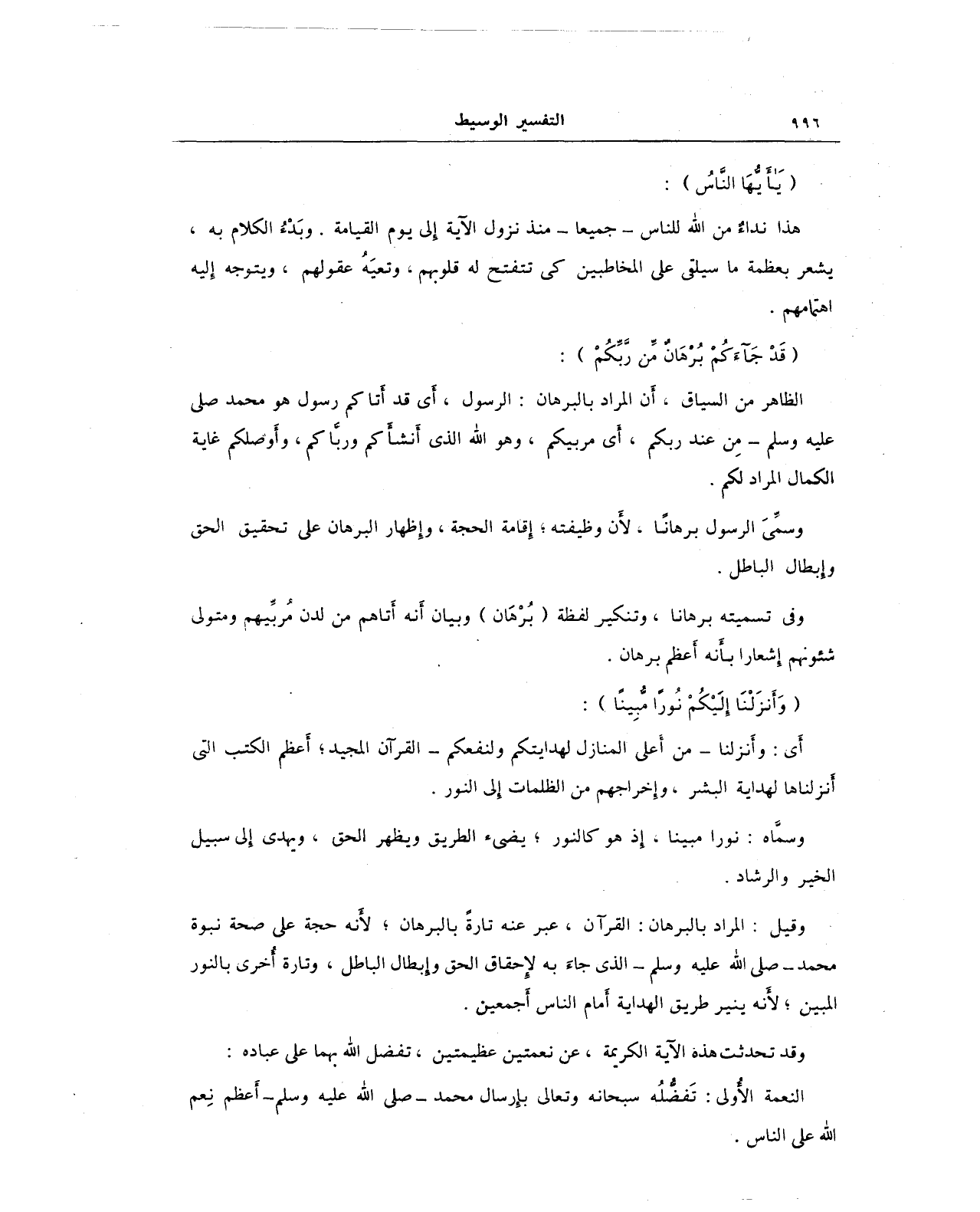 الظاهر من السياق، أَن المراد بالبرهان: الرسول، أَي قد أَتاكم رسول هو محمَّد - صلى الله عليه وسلم - مِن عند ربكم، أَي مربيكم، وهو الله الذي أنشأَكم وربَّاكم، وأَوصلكم غاية الكمال المراد لكم.