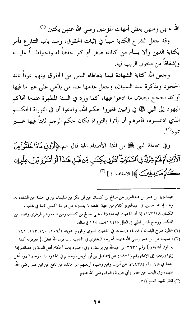 وجعل الله كتابة الشهادة فيما يتعاطاه الناس من الحقوق بينهم عوناً عند الجحود وتذكرة عند النسيان، وجعل عدمها عند من يدّعي على غير ما فيها أوكد الحجج ببطلان ما ادعوا فيها، كما ورد في السنة المطهرة عندما تحاكم اليهود إلى النبي صلى الله عليه وسلم في زانيين فغيروا حكم الله، وادعوا أن في التوراة الحكم الذي ادعوه، فأمرهم أن يأتوا بالتوراة فكان حكم الرجم ثابتاً فيها غير مموه (2) .