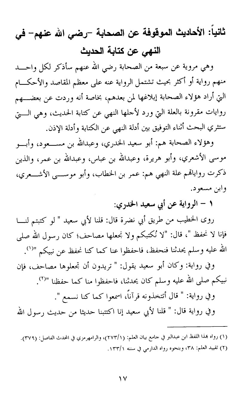 ثانياً: الأحاديث الموقوفة عن الصحابة -رضي الله عنهم- في النهي عن كتابة الحديث