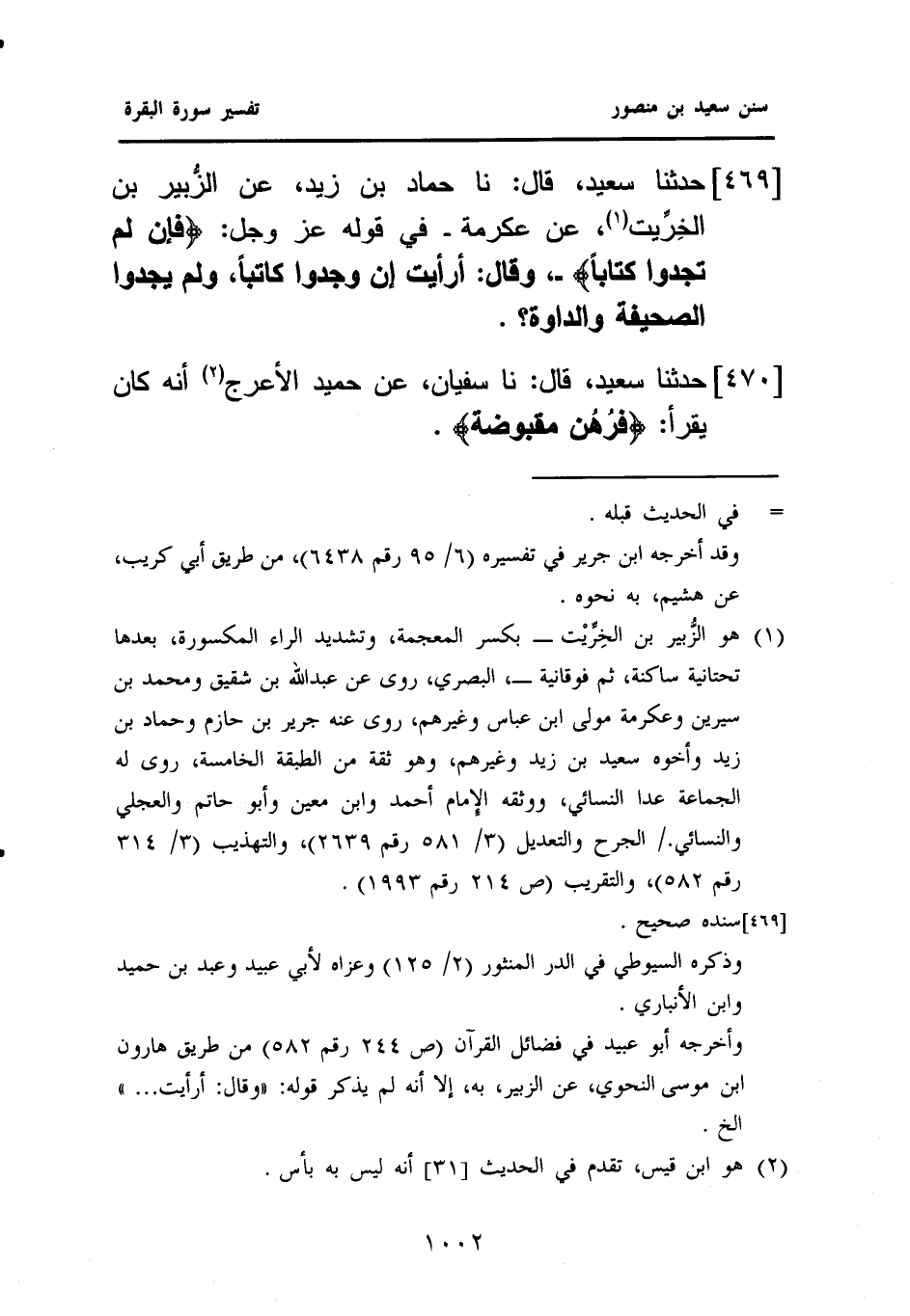 ٤٦٩ - حَدَّثَنَا سَعِيدٌ، قَالَ: نا حَمَّادُ بْنُ زَيْدٍ، عَنِ الزُّبير بْنِ الخِرِّيت (¬١)، عَنْ عِكْرِمَةَ - فِي قَوْلِهِ عَزَّ وَجَلَّ: {فَإِنْ لَمْ تَجِدُوا كِتَابًا} -، وَقَالَ: أَرَأَيْتَ إِنْ وَجَدُوا كَاتِبًا، وَلَمْ يَجِدُوا الصَّحِيفَةَ وَالدَّوَاةَ؟.