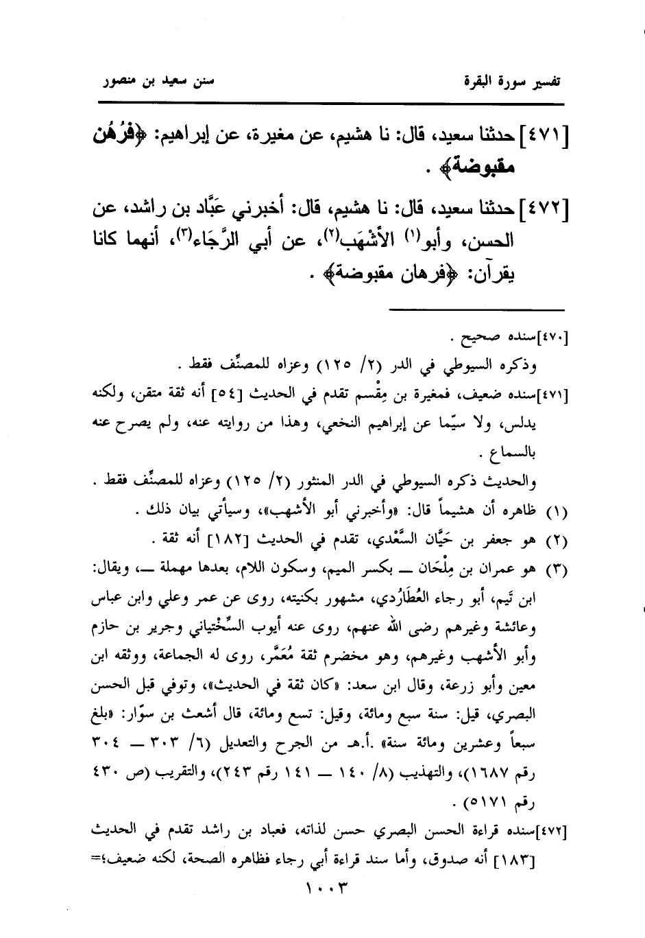 ٤٧٢ - حَدَّثَنَا سَعِيدٌ، قَالَ: نا هُشَيْمٌ، قَالَ: أَخْبَرَنِي عَبَّاد بْنُ رَاشِدٍ، عَنِ الْحَسَنِ، وَأَبُو (¬١) الأشْهَب (¬٢)، عَنْ أَبِي الرَّجَاء (¬٣) أَنَّهُمَا كَانَا يقرآن: {فَرِهَانٌ مَقْبُوضَةٌ}.