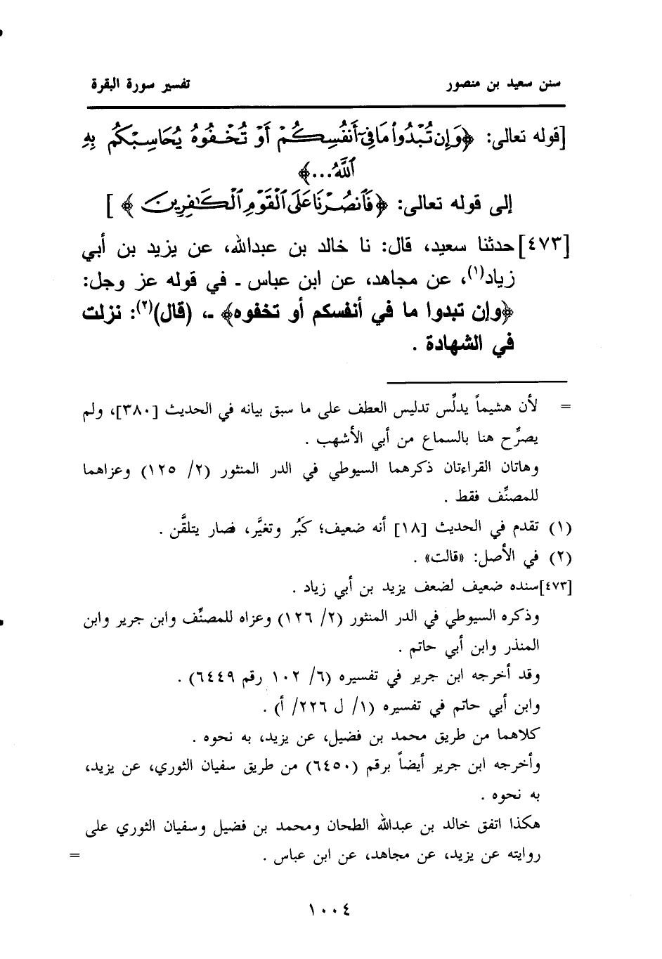 ٤٧٣ - حَدَّثَنَا سَعِيدٌ، قَالَ: نا خَالِدُ بْنُ عَبْدِ اللَّهِ، عَنْ يَزِيدَ بْنِ أَبِي زِيَادٍ (¬١)، عَنْ مُجَاهِدٍ، عَنِ ابْنِ عَبَّاسٍ - فِي قَوْلِهِ عَزَّ وَجَلَّ: {وَإِنْ تُبْدُوا مَا فِي أَنْفُسِكُمْ أَوْ تُخْفُوهُ} -، (قال) (¬٢): نزلت في الشهادة.