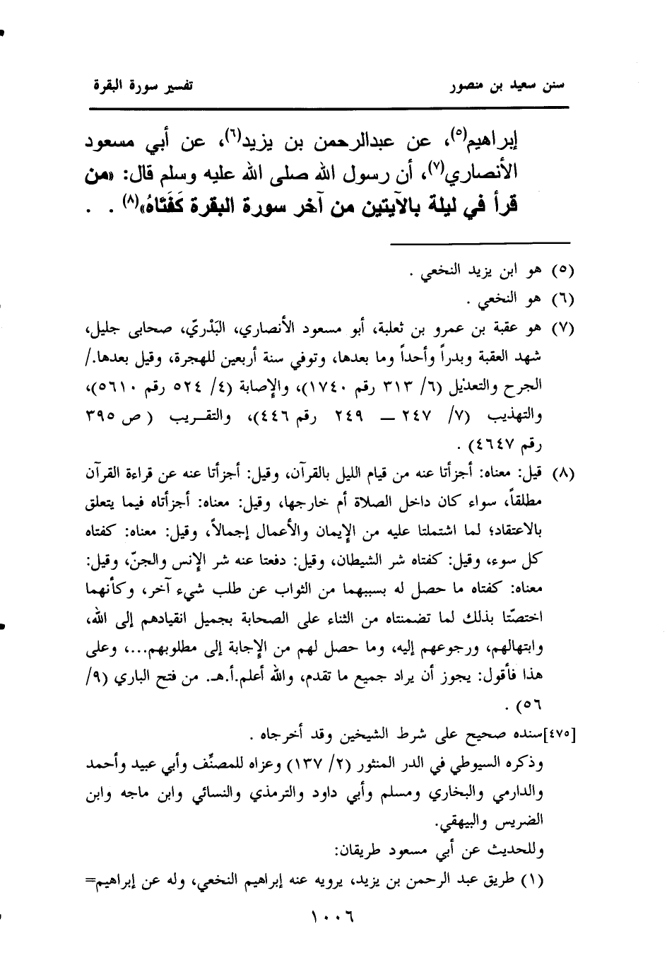 إِبْرَاهِيمَ (¬٥)، عَنْ عَبْدِ الرَّحْمَنِ بْنِ يَزِيدَ (¬٦)، عَنْ أَبِي مَسْعُودٍ الْأَنْصَارِيِّ (¬٧): أَنَّ رَسُولَ اللَّهِ - صَلَّى اللهُ عَلَيْهِ وَسَلَّمَ - قَالَ: ((مَنْ قَرَأَ فِي لَيْلَةٍ بِالْآيَتَيْنِ مِنْ آخِرِ سورة البقرة كَفَتَاهُ)) (¬٨).