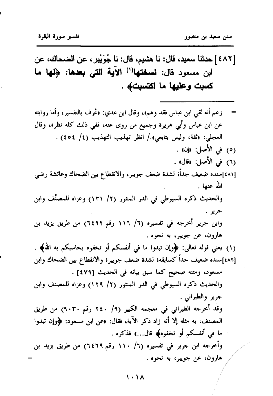 ٤٨٢ - حَدَّثَنَا سَعِيدٌ، قَالَ: نا هُشَيْمٌ، قَالَ: نا جُويبر، عَنِ الضَّحَّاكِ، عَنِ ابْنِ مَسْعُودٍ قَالَ: " نَسَخَتْهَا (¬١) الْآيَةُ الَّتِي بَعْدَهَا: {لَهَا مَا كَسَبَتْ وَعَلَيْهَا مَا اكْتَسَبَتْ}.