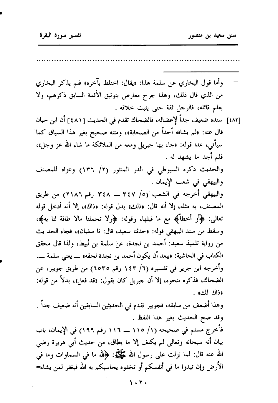 والبيهقي أخرجه في "الشعب" (٥ / ٣٤٧ - ٣٤٨ رقم ٢١٨٦) من طريق المصنف، به مثله، إلا أنه قال: ((ذلك)) بدل قوله: ((ذاك)) ، إلا أنه أدخل قوله تعالى: {أو أخطأنا} مع ما قبلها، وقوله: {وَلَا تُحَمِّلْنَا مَا لَا طَاقَةَ لنا به} ، وسقط من سند البيهقي قَوْلِهِ: ((حَدَّثَنَا سَعِيدٌ، قَالَ: نَا سفيان)) ، فجاء الحديث من رواية تلميذ سعيد: أحمد بن نجدة، عن سلمة بن نُبيط، ولذا قال محقق الكتاب في الحاشية: ((يبعد أن يكون أحمد بن نجدة لحقه)) - يعني سلمة - وأخرجه ابن جرير في "تفسيره" (٦ / ١٤٣ رقم ٦٥٣٥) من طريق جويبر، عن الضحاك، فذكره بنحوه، إلا أن جبريل كان يقول: ((قد فعل)) ، بدلاً من قوله: ((ذاك لك)) .