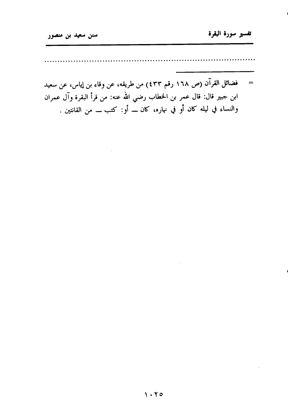 = "فضائل القرآن" (ص ١٦٨ رقم ٤٣٣) من طريقه، عن وقاء بن إياس، عَنْ سَعِيدِ بْنِ جُبَيْرٍ قَالَ: قَالَ عُمَرُ بْنُ الْخَطَّابِ - رَضِيَ اللَّهُ عَنْهُ -: مَنْ قَرَأَ الْبَقَرَةَ وآل عمران والنساء في ليله كان أو في نهاره، كان - أو: كتب - من القانتين.
