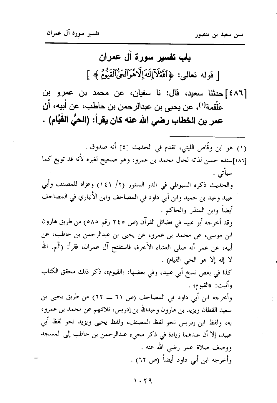 ٤٨٦ - حَدَّثَنَا سَعِيدٌ، قَالَ: نا سُفْيَانُ، عَنْ مُحَمَّدِ بْنِ عَمْرِو بْنِ عَلْقمة (¬١)، عَنْ يَحْيَى بْنِ عَبْدِ الرَّحْمَنِ بْنِ حَاطِبٍ، عَنْ أَبِيهِ: أَنَّ عُمَرَ بْنَ الْخَطَّابِ رَضِيُ اللَّهُ عَنْهُ كَانَ يَقْرَأُ: (الحيُّ القَيَّام).