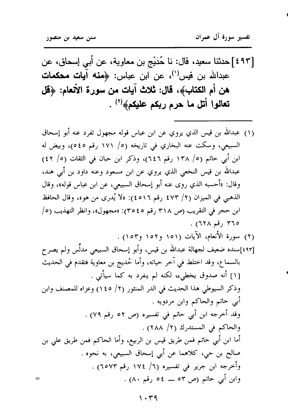 ٤٩٣ - حَدَّثَنَا سَعِيدٌ، قَالَ: نا حُدَيْج بنُ مُعَاوِيَةَ، عَنْ أَبِي إِسْحَاقَ، عَنْ عَبْدِ اللَّهِ بْنِ قَيْسٍ (¬١)، عَنِ ابْنِ عَبَّاسٍ: {مِنْهُ آيَاتٌ مُحْكَمَاتٌ هُنَّ أُمُّ الكِتَابِ}، قَالَ: ثَلَاثُ آيَاتٍ مِنْ سُورَةِ الْأَنْعَامِ: {قُلْ تَعَالَوْا أَتْلُ مَا حَرَّمَ رَبُّكُمْ عَلَيْكُمْ} (¬٢).